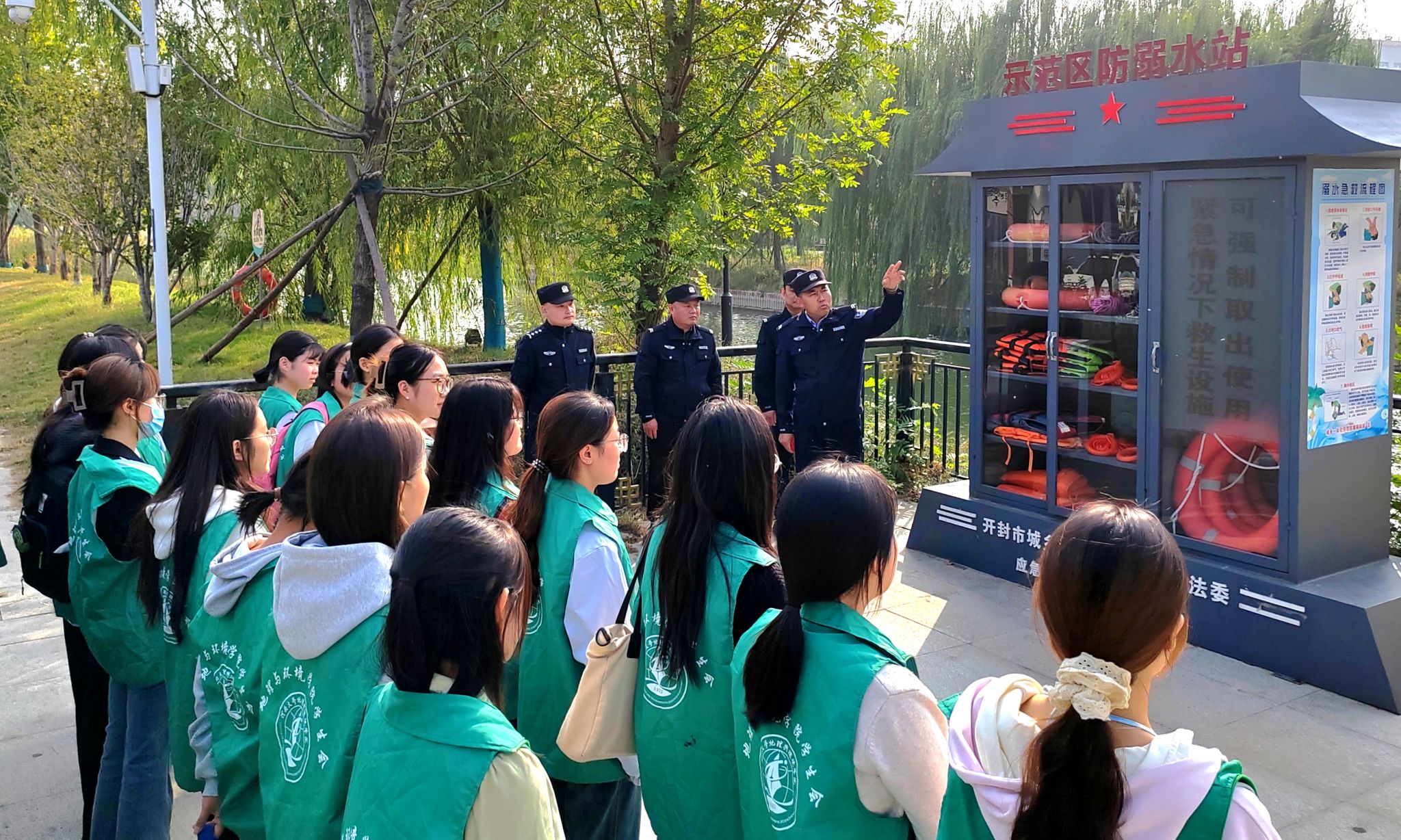 本次的防溺水安全教育活动包含室内理论讲解和室外防溺水实操两个部分。首先在社区工作人员的生动讲解下,我院学生初步了解到了溺水的危害、发生原因和预防措施。随后社区工作人员结合真实案例,深入浅出地讲解防溺水的重要性以及安全游泳的必要性,进一步提高了学生的安全意识。同时,此次活动还通过互问互答、情景模拟等生动有趣的方式,让我院学生在轻松愉快的氛围中基本掌握关于溺水的自救与互救技能。在室外防溺水实操环节,社区工作人员带领我院学生参观了梁苑示范区的防溺水工作站,并详细地介绍了示范区防溺水站的救援设备以及救生衣和救生圈的正确穿戴与使用方法。我院学生积极参与实践并在实践中相互帮助,确保彼此都能熟练掌握这些救援设备的使用技巧。