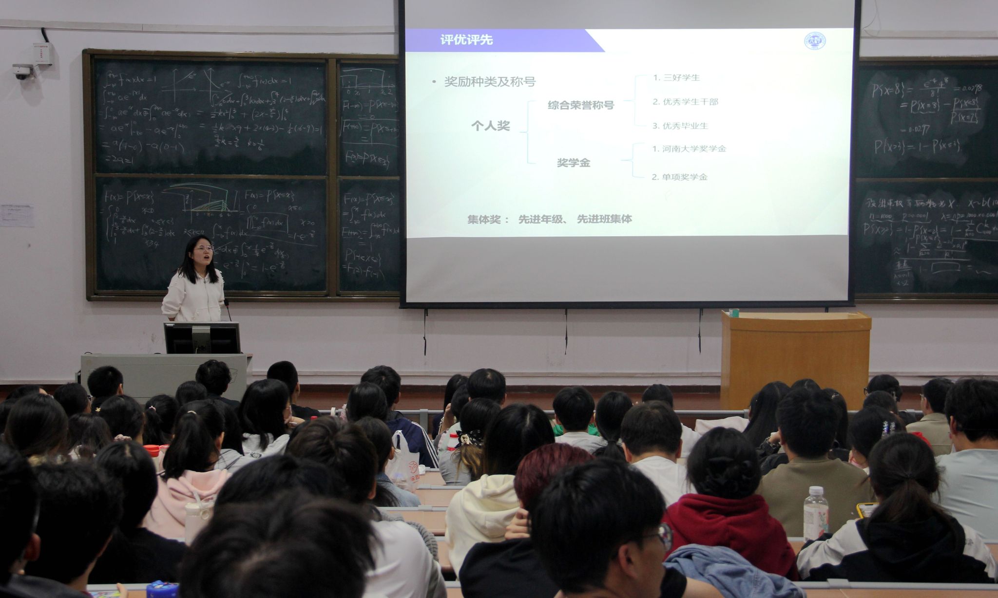 会议伊始,屈利铭带领与会学生学习了《yl23411永利集团官网学生手册》和《高等学校学生行为准则》的相关内容,阐述了在校学生所享有的权利和应当履行的义务。她表示大学生在校期间应当强化底线意识,养成良好的行为规范。在学生奖励与处分方面,她向与会学生介绍了三好学生、优秀学生干部等评优评先的基本条件和评价标准,同时提到了国家奖学金、国家励志奖学金、yl23411永利集团官网奖学金等各类奖学金的申请要求和奖励方法,并借此鼓励学生们学习先进,勇争上游,努力取得属于自己的奖励与荣誉。最后,屈利铭总结了上一学年以及学生近期的学习生活情况,鼓励学生们努力学习,把握大二学年这一关键阶段,积极参与实践活动与专业竞赛,促进自身全面发展,在未来的大学生活中书写自己的华丽篇章。