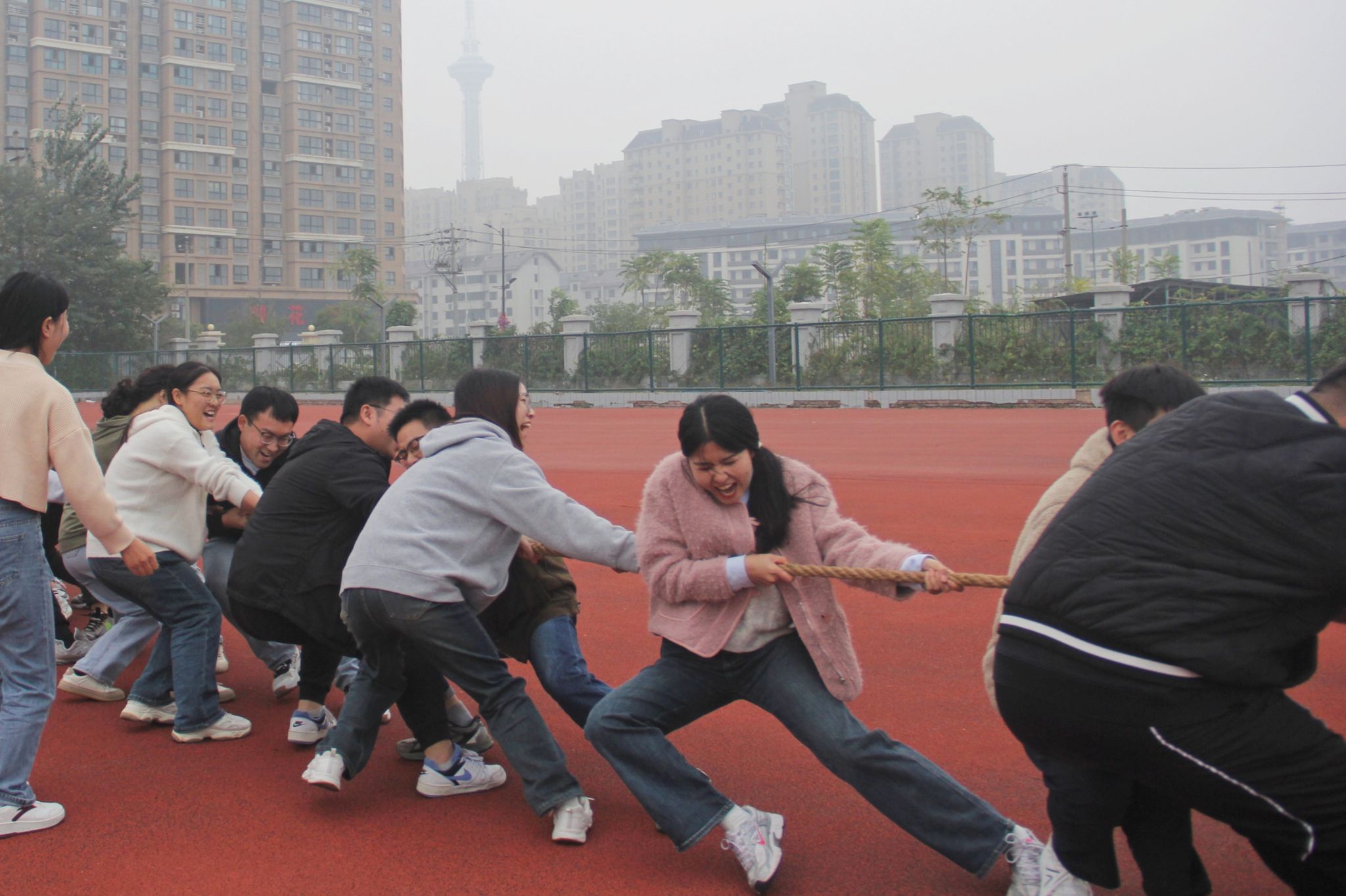 在运动会的赛场上,一场没有硝烟却激情澎湃的战争——拔河比赛,正在激烈上演。紧张的气息弥散在每一寸土地上,学生们双手紧握绳索,脚踏实地,汇集全身的力量来争夺胜利的荣誉。观众们也齐声呐喊,助威声此起彼伏,点燃了整个运动会的激情与活力。