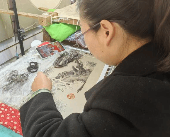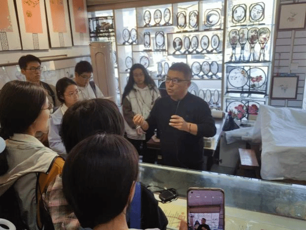 在和合绣庄汴绣馆,兴趣小组的成员们纷纷对原汴绣厂非遗传承人曹经理进行了访谈。他重点介绍了汴绣的起源、技艺工序和行业困境,呼吁更多年轻人关注汴绣的弘扬与传承,切实为汴绣的传承发展多做贡献。经过现场的学习和答疑,同学们对传统文化产生了浓厚的兴趣,希望今后能结合所学专业大力推进非遗进校园,让更多的大学生了解非遗、传承非遗。
