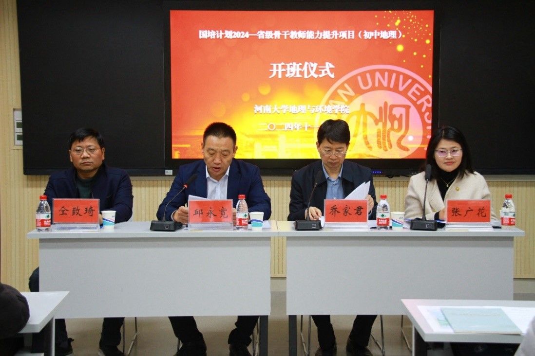 11月5日上午,“国培计划2024”——省级骨干教师能力提升项目(初中地理)培训班开班仪式在yl23411永利集团官网地理与环境学院的环境与规划国家级实验教学示范中心101教室召开。地理与环境学院党委书记乔家君,副院长邱永宽,学科教学硕士生导师张广花副教授,继续教育中心主任仝致琦以及省级骨干教师能力提升项目(初中地理)培训班全体学员参加此次典礼,开班仪式由邱永宽主持。
