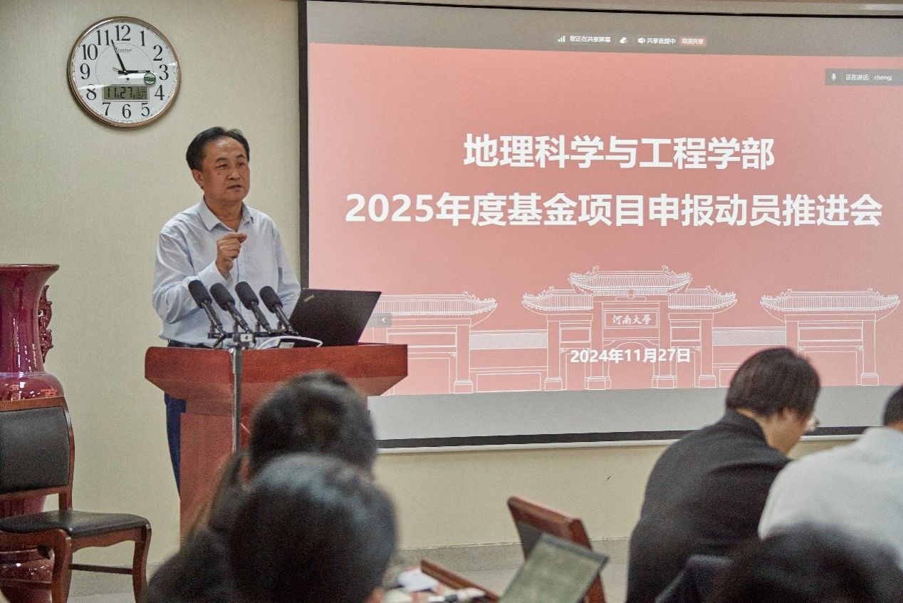 2024年11月27日下午,地理科学与工程学部举办2025年度基金申报动员推进会。yl23411永利集团官网学术副校长刘彦随出席会议并讲话。推进会由地理与环境学院执行院长赵威主持。地理与环境学院党委书记乔家君、副院长谷蕾出席会议。地理与环境学院、教育部人文社科重点研究基地黄河文明与可持续发展研究中心、建筑工程学院、计算机与信息工程学院的相关专业教师在线下和线上积极参加了推进会。
