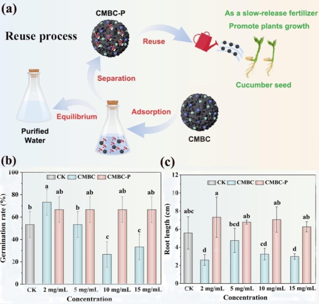 图3. CMBC的再利用过程(a),CMBC和CMBC-P处理黄瓜幼苗的种子发芽率(b)和根长(c)。 |
