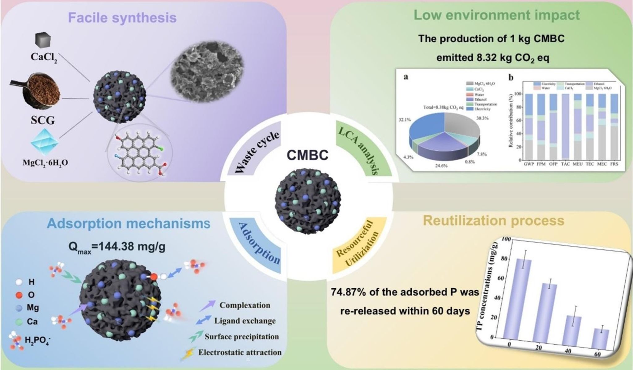 大量来自农用化学品和工业污水的含磷废水被排放至水体环境中,导致这种宝贵的不可再生资源的浪费。磷资源的快速消耗将会对全球粮食安全构成严重威胁。因此,利用高效吸附剂从废水中回收多余的磷,然后作为潜在的磷资源进行再利用或许是解决这一问题的有效方案。研究团队通过浸渍-热解法一步制备了低成本的钙镁共改性生物炭(CMBC),用于回收废水中的磷并将其以缓释肥料进行再利用,评估了其缓释性能和环境影响(图1)。