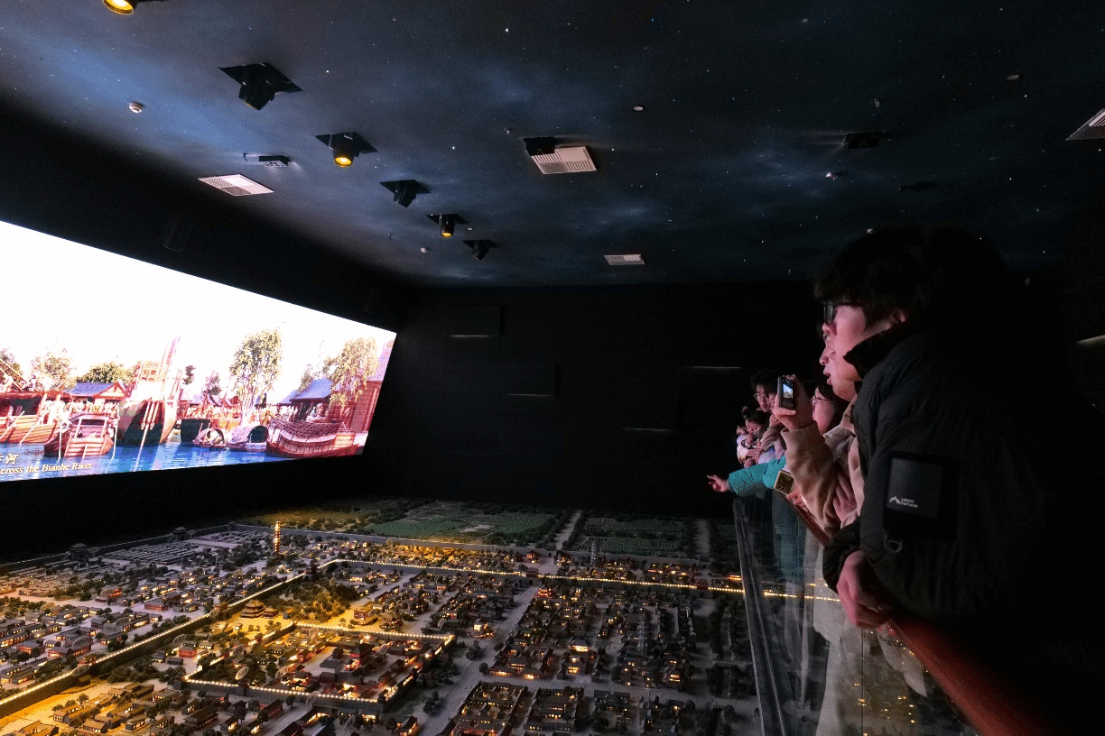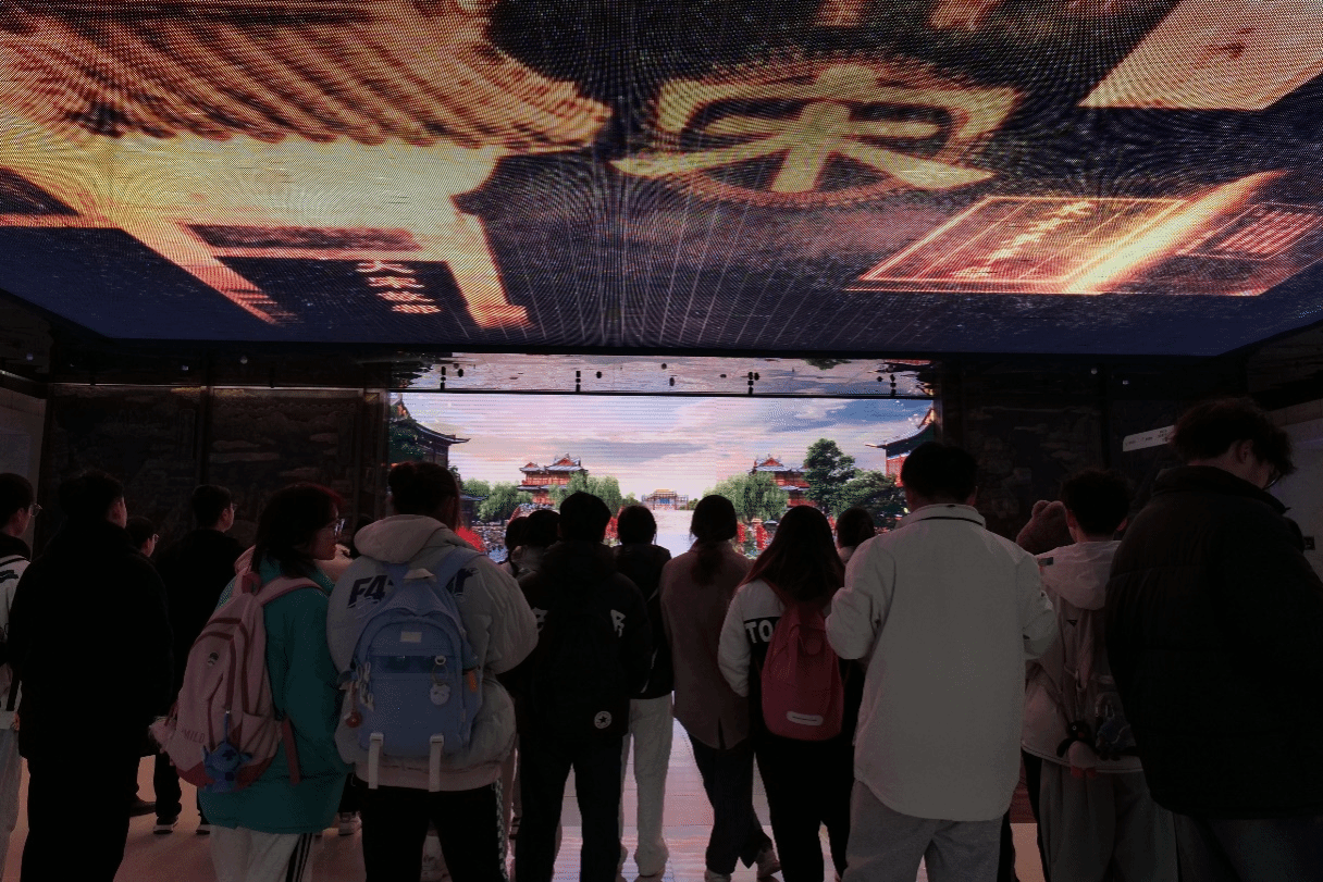 接着,“北宋东京城”的主题展览将师生带回到北宋时代,使学生深入感受东京城在城市结构、城市交通、城市管理、造园艺术多方面的领先性,在商业贸易、文化交流方面的国际性,在市民艺术方面的丰富性。在此过程中,杨阳以清明上河图为例,向学生们介绍北宋时期东京城的市井文化、商业文化,细腻地解读了东京城的繁华景象。姚飞谈到,开封的中轴线历经千年的沧桑、时代的变迁,但其中轴线却始终从未发生变化,是世界上独有的景象,激发了学生们的广泛讨论。