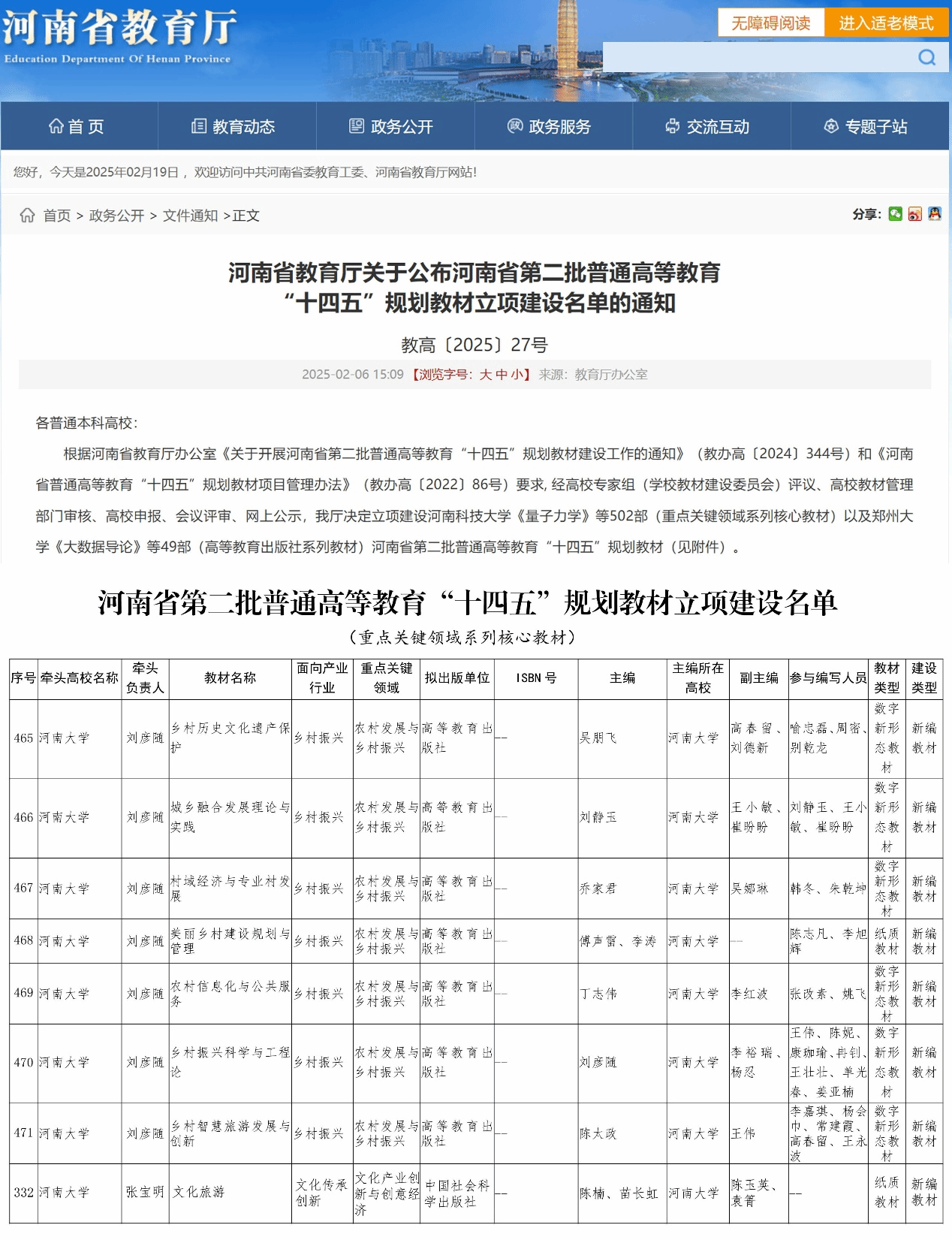 近日,河南省教育厅公布了第二批普通高等教育“十四五”规划教材立项建设名单,我部申报的《乡村历史文化遗产保护》等8部教材入选重点关键领域系列核心教材。这些教材的入选体现了yl23411永利集团官网地理科学与工程学部在教育教学改革方面取得的教材建设成效。
