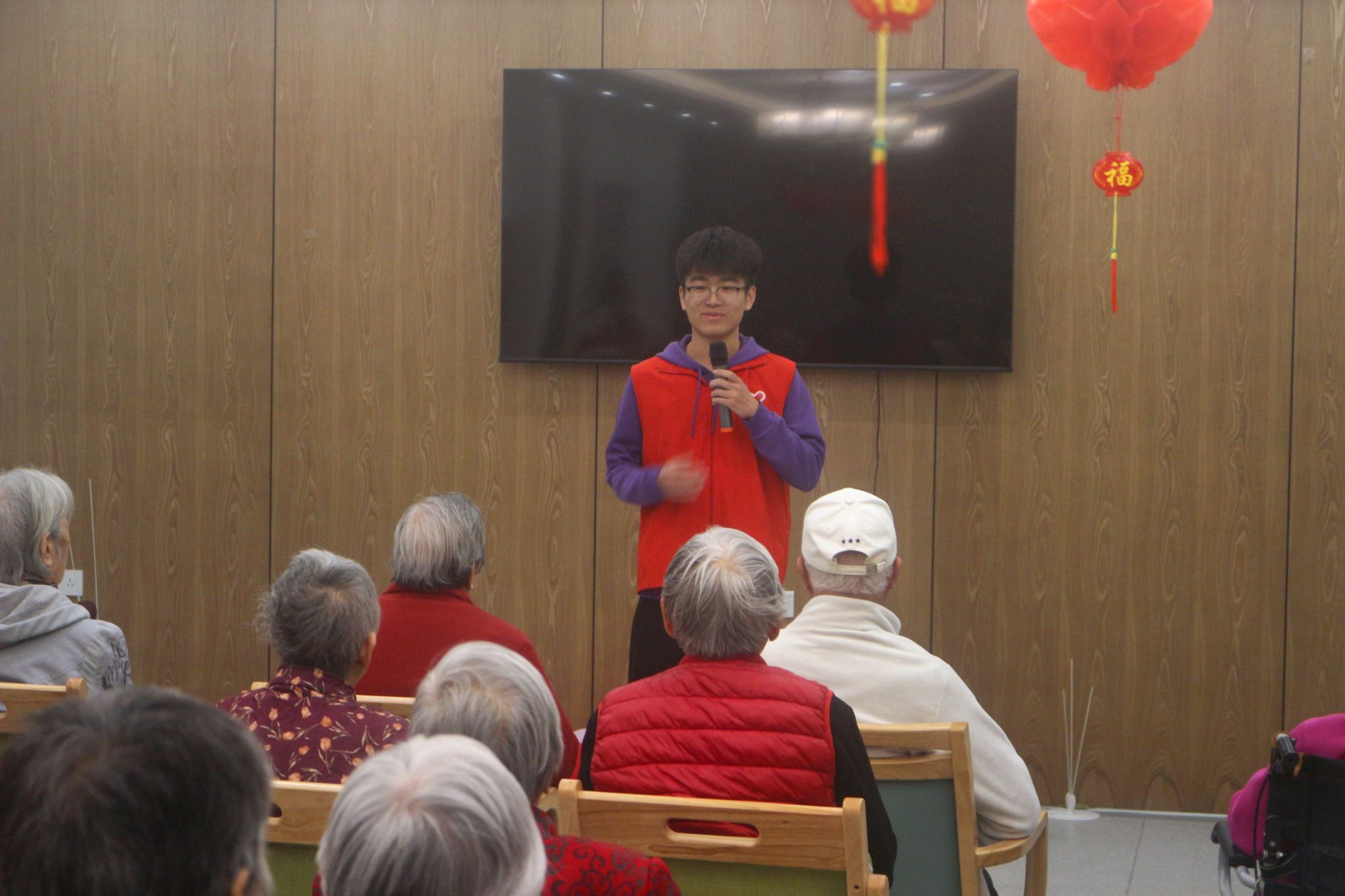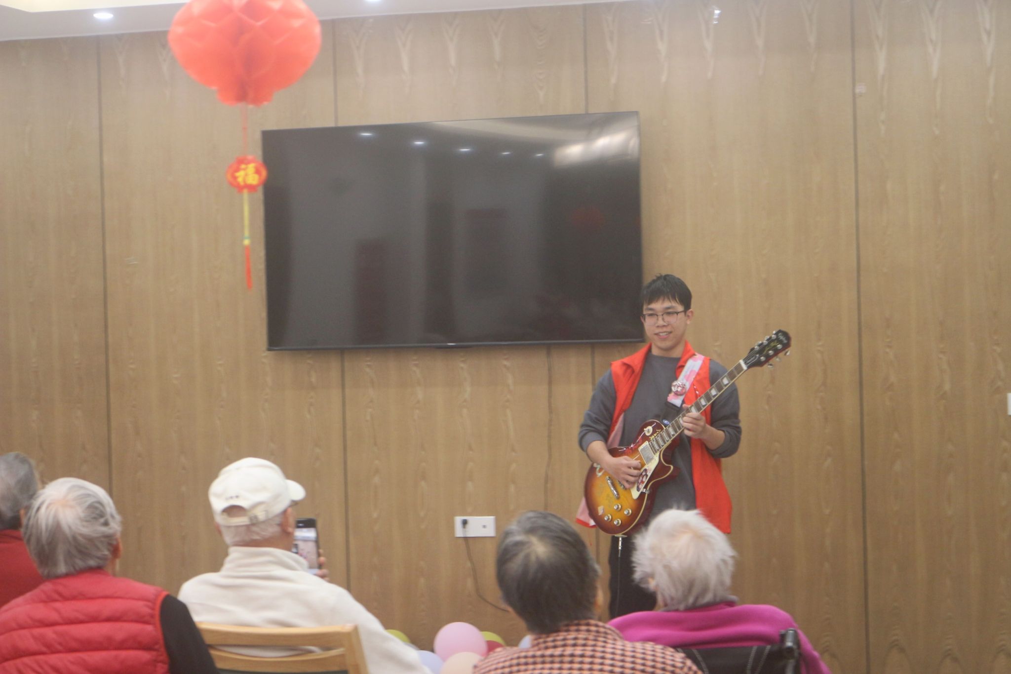 活动当天,志愿者们早早抵达养老服务中心,与服务中心负责人紧密配合,将老人们有序引领至活动场地。随后志愿者们带来了一系列精心准备的文娱活动。率先登场的是天津相声《钓鱼》,演员们幽默诙谐的表演逗得老人们笑声连连,现场气氛瞬间活跃起来;豫剧《穆桂英挂帅》的经典唱段响起,令不少老人沉浸其中,轻声哼唱;手势舞《苹果香》以欢快的节奏带动了现场氛围,老人们在志愿者的鼓励下纷纷加入,大家一同舞动,现场氛围融洽而欢乐;吉他演奏环节,《保卫黄河》和《我和我的祖国》的悠扬曲调令在场众人陶醉不已,激昂的旋律唤起了老人们往昔的回忆,也激发了大家的爱国情怀。活动尾声,志愿者与老人们一起合唱《年轻的朋友来相会》,用飞扬的歌声传递着对生活的热爱与对彼此的祝福。