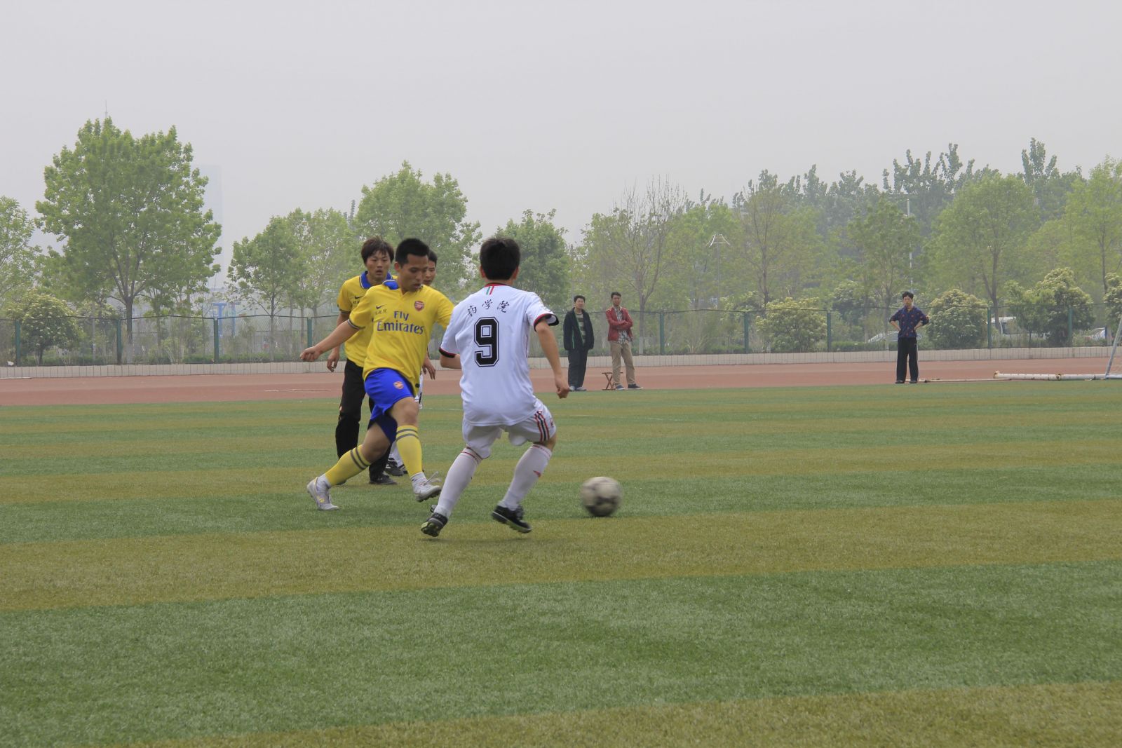 比赛场上,同学们各展风采,尽显青春活力。同学们精准的传球,娴熟的配合,刁钻的射门,令人叫绝,双方队员都展示了很高的球技和水平。其中我院一位球员身姿敏捷,通过跳起顶球、地滚球、盘球、带球等精彩的表现,博得观众一阵叫绝喝彩声。河大杯足球赛不仅充满了希望、阳光、友谊、为各学院之间的合作交流搭建了平台,真正实现了切磋球艺、增进交流、加深友谊、促进团结的目的。每位球员,包括拉拉队在内都享受到了足球带来的快乐。