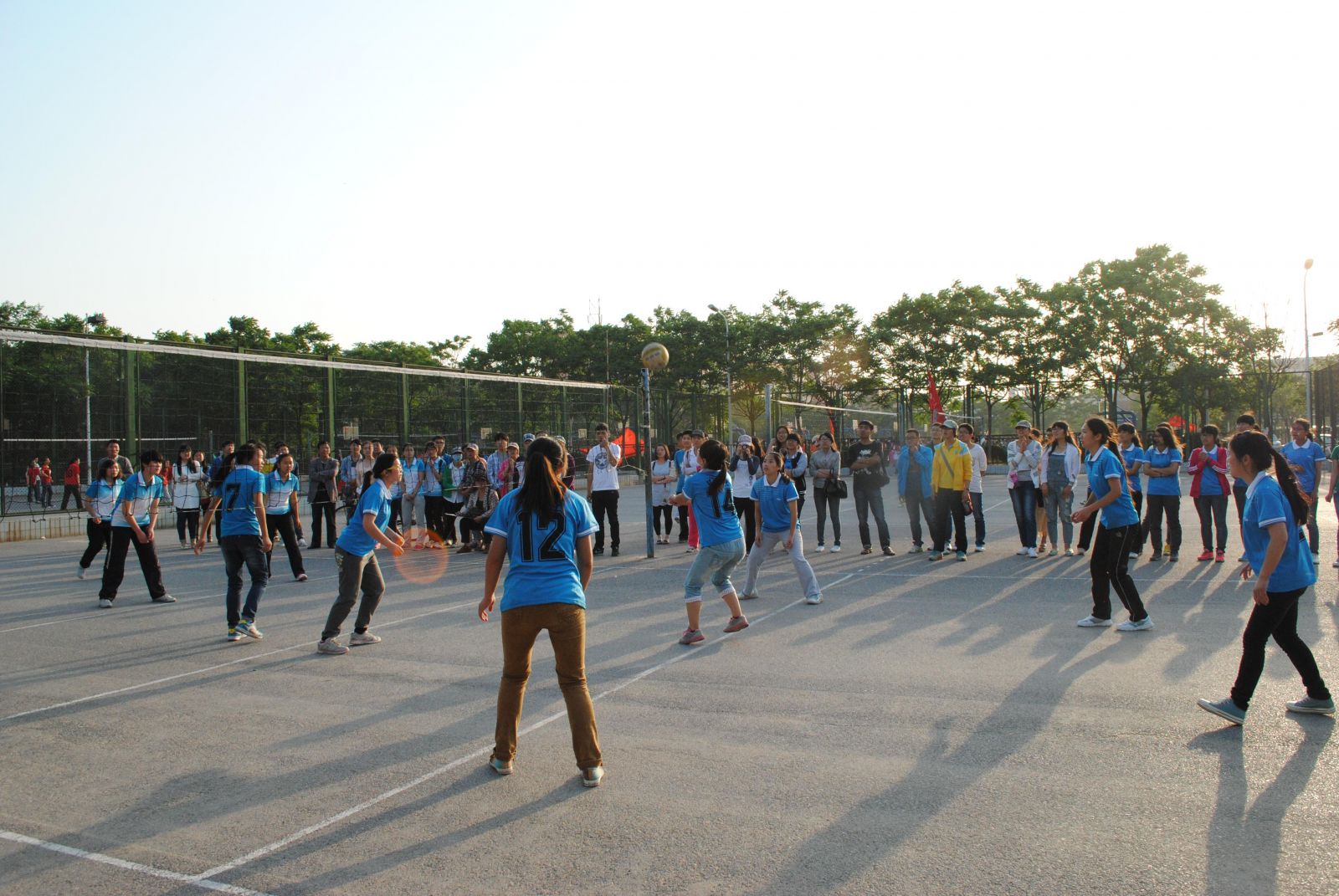 比赛于17:30正式开始。赛前,篮球场上的运动健儿们都紧张的进行赛前热身,排球场上的女将们也积极投入准本,为迎战接下来的比赛而摩拳擦掌。比赛在响亮的哨音中正式开始,双方选手全神贯注地投入到激烈的对战之中,双方你来我往,无论是小球还是大球,都盘桓在双方手里,没有一刻停歇,两边场地的霸王之战都可谓不可开交。操场周围站满了前来观战的拉拉队,为场上运动健将们精彩的表现送去阵阵的欢呼声,为他们加油打气。在这边篮球场上运动员全神贯注的运球,抢球、投篮、助攻,挥汗如雨的与对方进行厮杀的同时,那边排球场上女生们正目不转睛的盯着球,人随球动,配合相当默契,把对方打得落花流水。本次排球比赛采取三局两胜制,我院排球队以二比零的优异成绩取得比赛的胜利。而篮球虽然29:46输给了经济学院,但是我院选手们的辛勤付出与精彩表现还是赢得了观众的掌声。