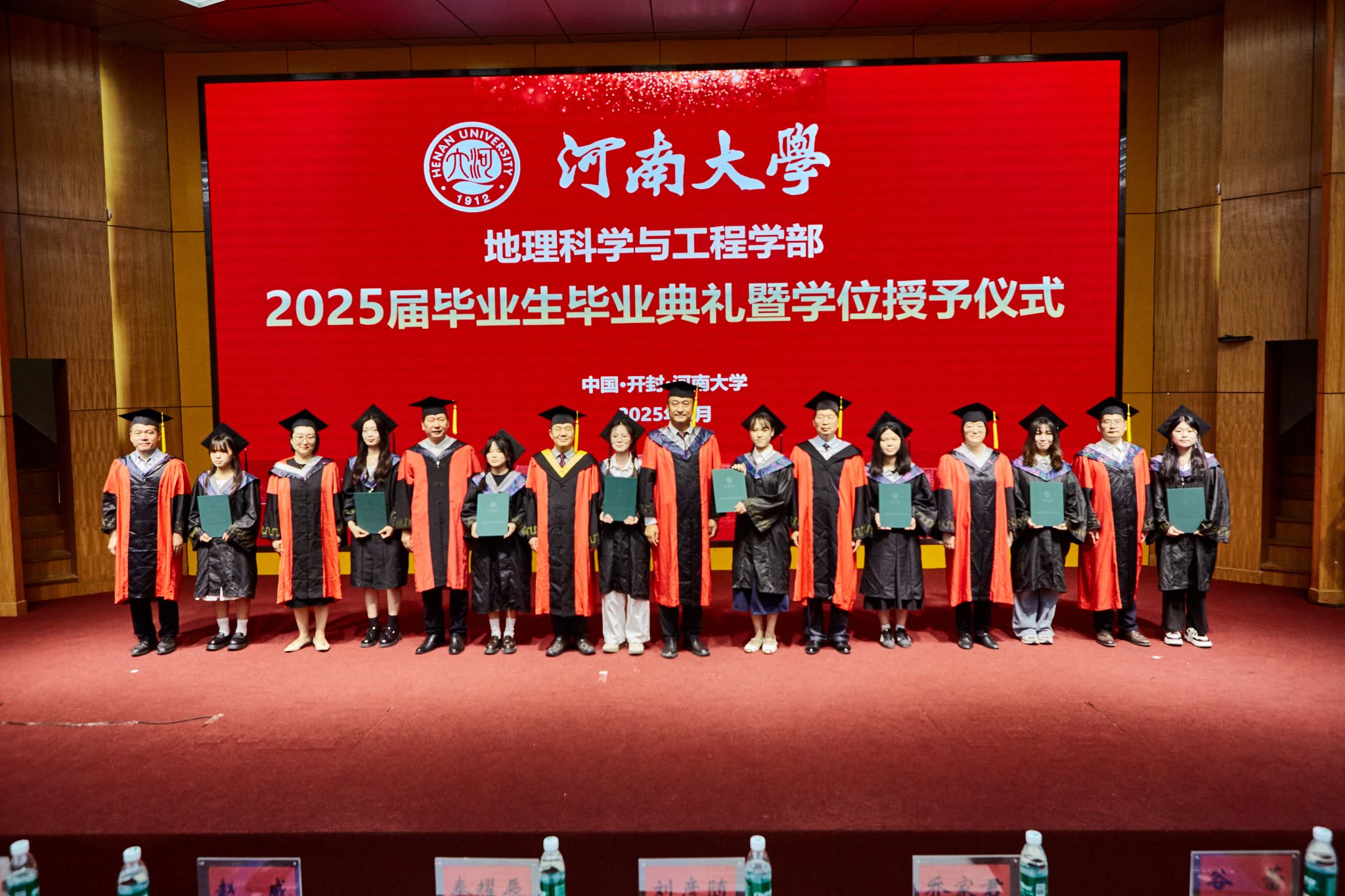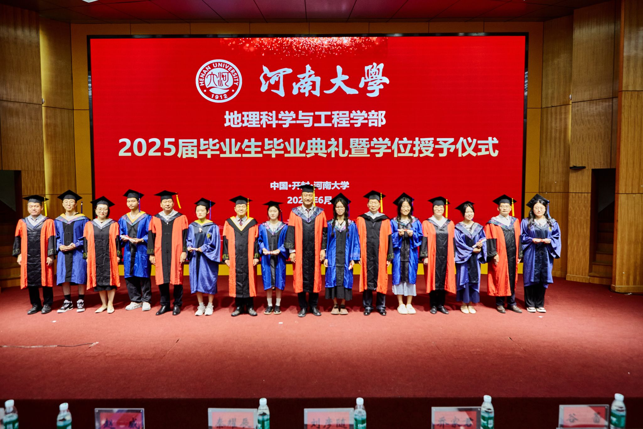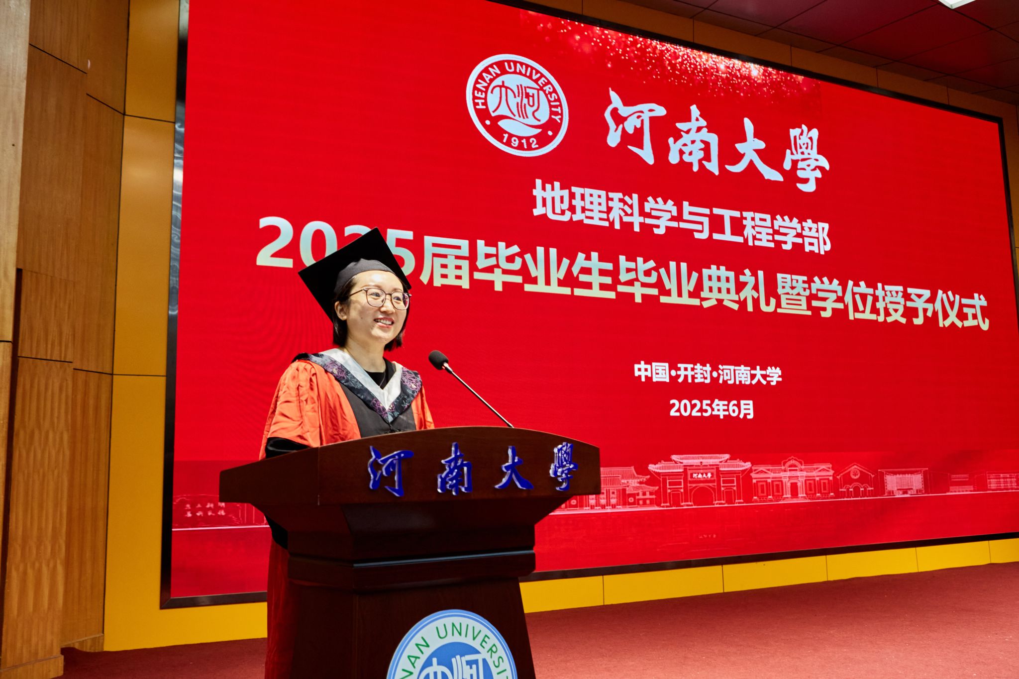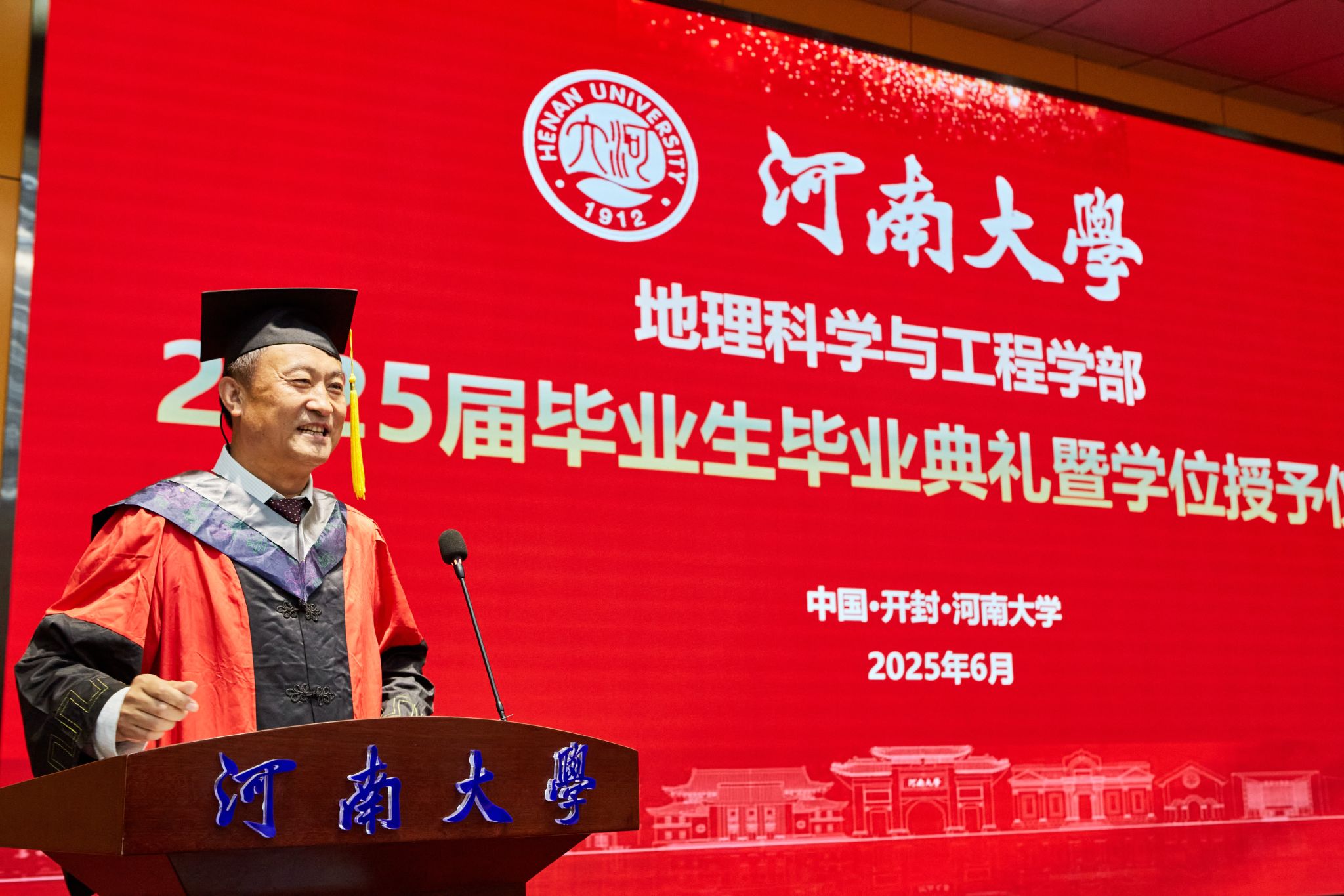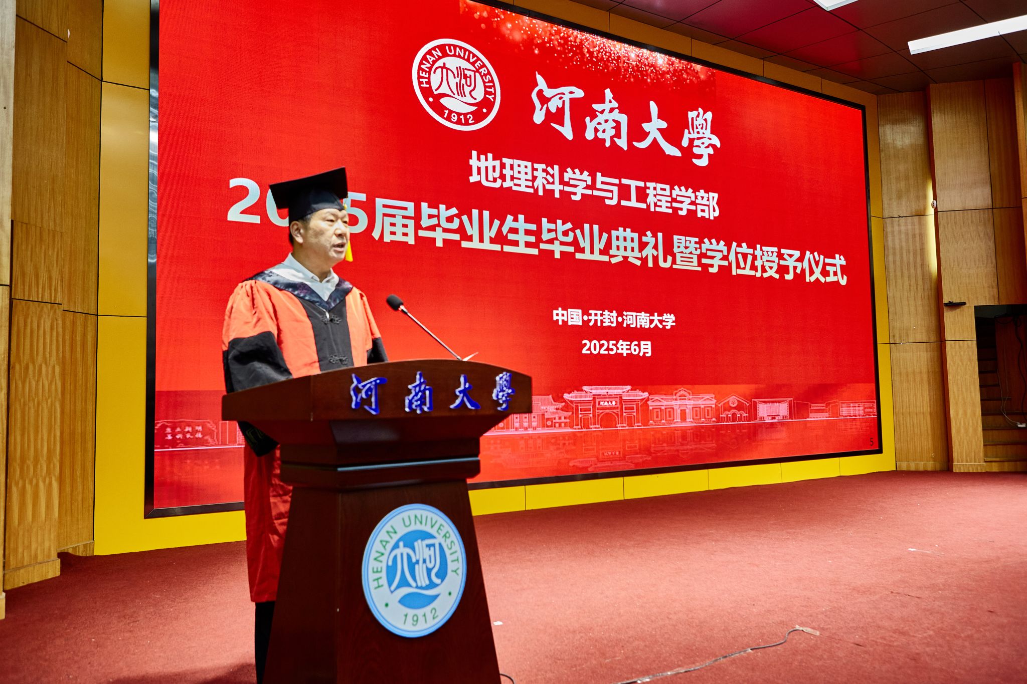 刘彦随向顺利完成学业的全体毕业生致以热烈祝贺,并深情回顾了地理科学与工程学部从初创到发展的奋进历程,介绍了成功共建空间基准全国重点实验室、构建河大地理学“STEP融通创新模式”与“36X地理学科体系”、启动开封凹陷千米钻探工程的可喜进展,阐释了力争新一轮学科评估与一流学科建设实现“双突破”的奋斗目标,以及学部近期推出的本科教学改革“2+2方案”、2025年即将开设的地理科学(林伯襄计划)尖子班和本硕博一体培养的景兰班。在工作回顾中,他高度肯定了毕业生在校期间为学部发展做出的积极付出和取得的优异成绩,也向他们提出四点殷切嘱托:一是铭记地学文脉,筑牢精神根基。以yl23411永利集团官网百年地学人探真理、量山河、报家国的血脉基因锚定人生方向,自觉践行“读万卷书、行万里路、谋万民福”的地理情怀与实践品格;二是传承科学精神,永葆探索热忱。毕业生们应始终秉持科学求实、追求真理、独立思考、大胆创新的科学精神;三是迎接转型挑战,书写事业华章。毕业生们在面对未来挑战时应胸怀经纬、脚踏实地,拥抱变化、终身学习,知行合一、服务社会;四是母校引以为荣,常念河大是家。作为学部的首届毕业生,应积极赋能河大地理学科发展,以奋进与收获做好榜样、奋勇增光。最后,他祝愿学部2025届全体毕业生:“胸怀山河志、脚踏天地宽,初心如磐石、前程似锦繁!”
