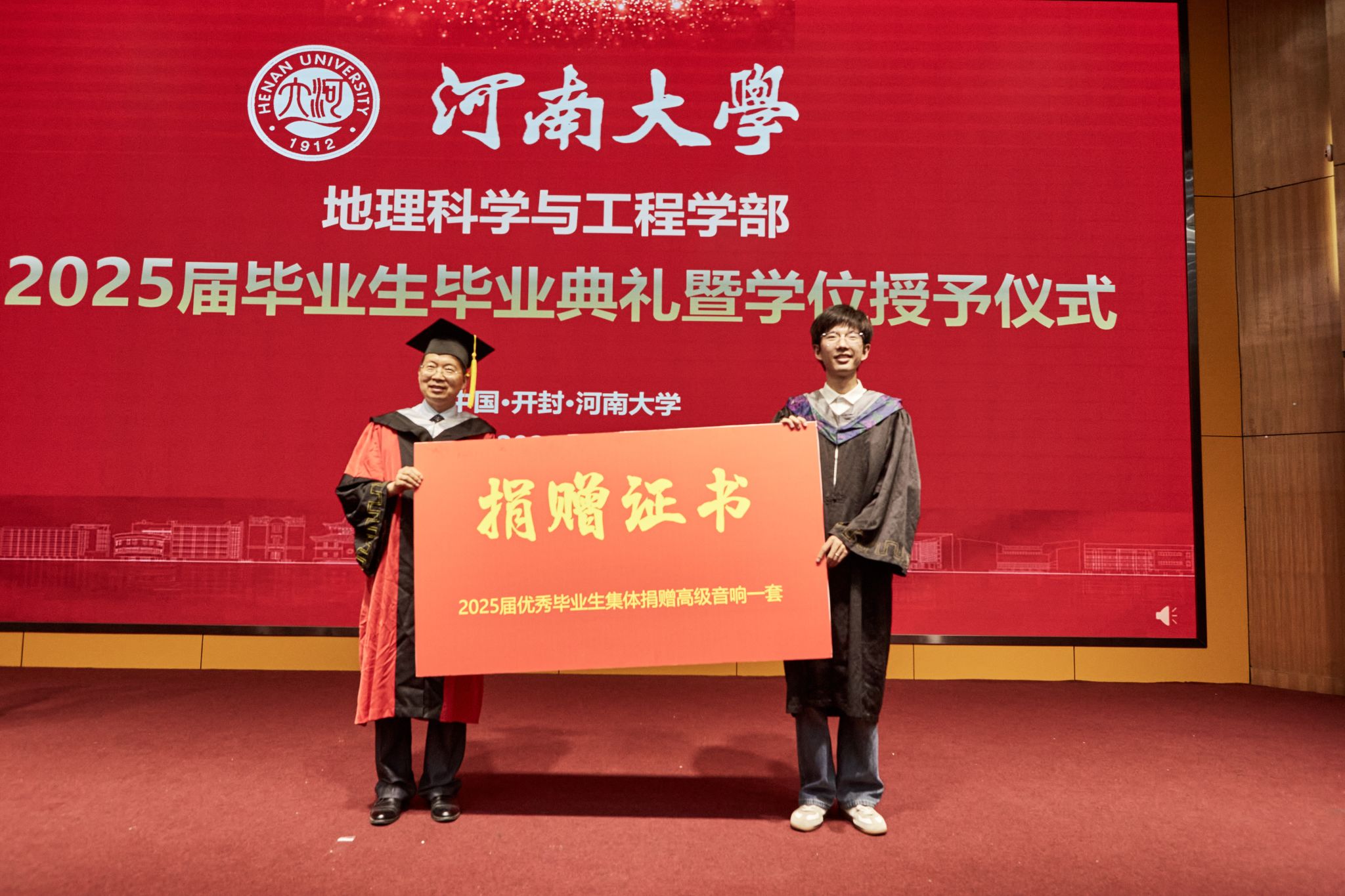 地理科学与工程学部委员、yl23411永利集团官网执行院长赵威宣读《yl23411永利集团官网关于授予普通本科毕业生学士学位的决定》。地理科学与工程学部委员、yl23411永利集团官网党委书记乔家君代表学部接受本科毕业生捐赠音响设备一套,并向2025届本科毕业生颁发捐赠证书。