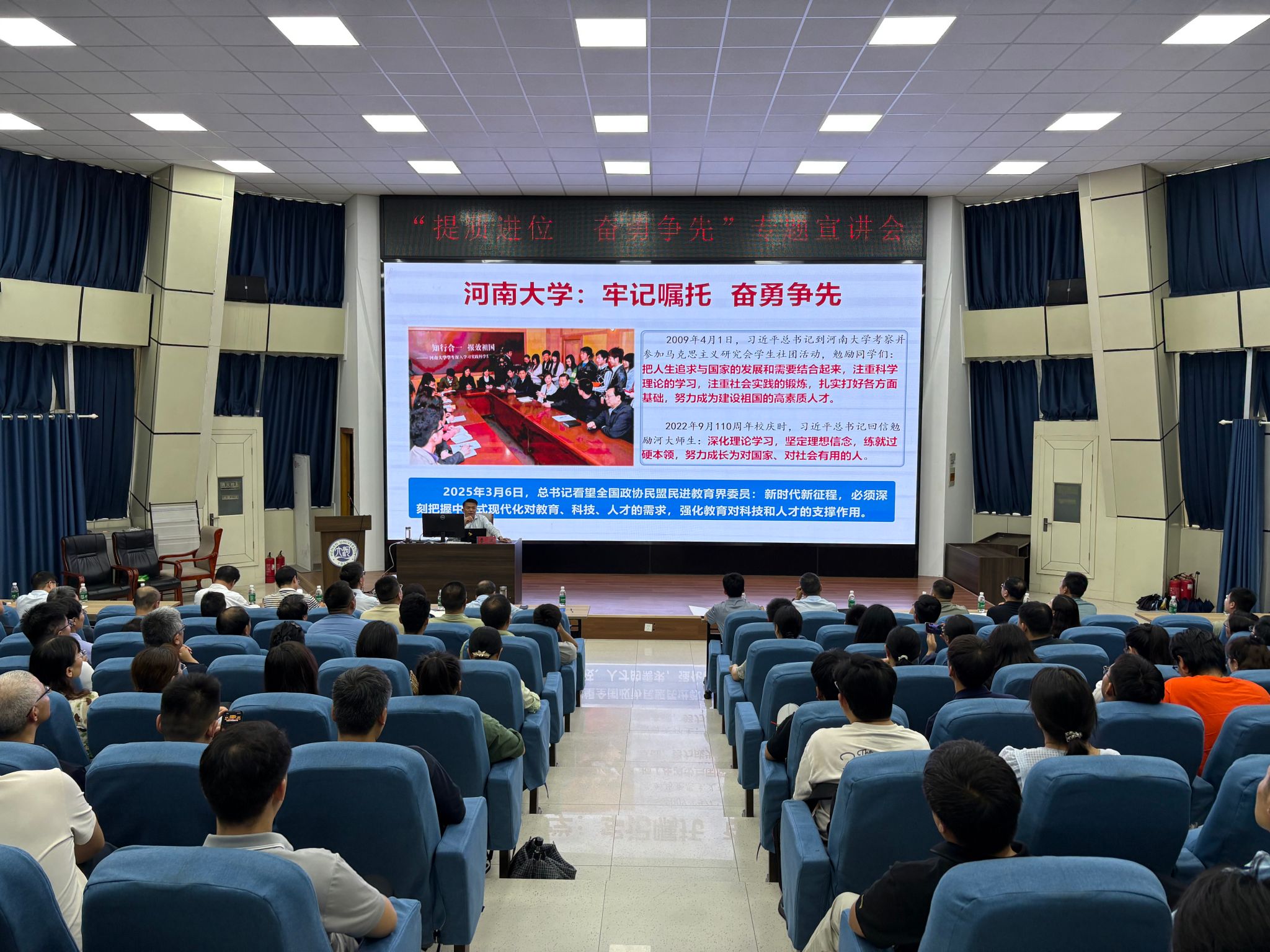 6月19日下午,校党委书记季波在金明校区锥形报告厅作“提质进位,奋勇争先”专题宣讲,校高层次人才办公室主任路杨、党委办公室副主任谢宇飞等同志出席,地理科学与工程学部、计算机与信息工程学院、农学院教职工及退休教师代表、学生代表参会。宣讲会由地理科学与工程学部委员、yl23411永利集团官网执行院长赵威主持。