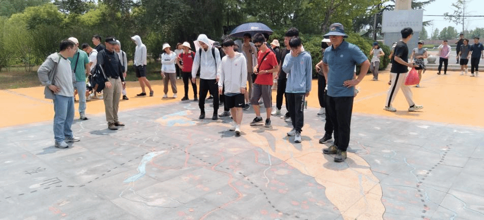 在花园口纪事广场,队伍面向黄土堆砌的堤岸肃立。师生们重温1938年黄河花园口决堤事件,缅怀战争灾难背景下的历史创伤。广场内浮雕与纪念墙记录着抗战时期人为决堤的惨烈后果,也提醒着当代人对流域安全与人水关系的持续反思。
