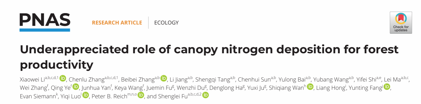 近日,国际著名学术期刊《美国科学院院刊》(PNAS)在线发表了yl23411永利集团官网地理科学与工程学部傅声雷教授团队题为Underappreciated role of canopy nitrogen deposition for forest productivity的最新研究成果。该研究依托河南大别山森林生态系统国家野外科学观测研究站,通过一项长达十年的大规模野外控制实验,首次系统量化了“冠层氮沉降”在提升森林生产力和碳固存中的关键作用,解决了该领域长达数十年的科学争议,为准确评估全球森林碳汇潜力、完善气候变化模型、服务“碳中和”战略目标提供了重要的科学依据。