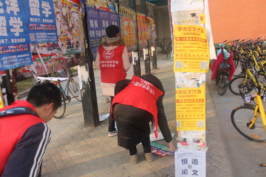 12月1日开始,学院青年志愿者对校园内各种不文明行为进行劝导,倡导同学们文明摆放自行车,遏制校园单车乱停乱放现象。志愿者清扫校园、清理路面和草丛垃圾,为同学们提供了一个干净整洁的学习环境。清扫整改活动中,志愿者们分工明确,热情参与,在大家的共同努力下,校园面貌焕然一新。