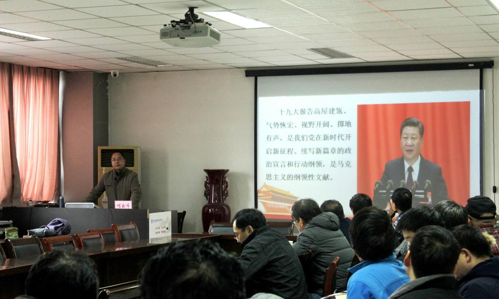 何云峰教授从“十九大的主题”“过去五年的历史性成就和历史性变革”“中国特色社会主义进入新时代”“新时代中国共产党的新使命”“重大战略部署”及“十九大对党章的重大修改”等十个方面对十九大报告内容进行了深入浅出的解读。他的解读逻辑框架清晰,论述旁征博引,语言生动幽默,为全院教职工带来了一场十九大报告解读的精神盛宴。之后,结合学校实际,何云峰教授又深入解读了卢克平书记、宋纯鹏校长在庆祝建校105周年暨学科建设工作会上的讲话精神,介绍了学校近期工作“一条主线,两项工程,三项基础保证”的工作思路。他鼓励在场教职工要在党的十九大精神引领下不忘初心、牢记使命,努力奋斗,争取在建设“双一流”大学的新征程中取得优异的成绩,迎来yl23411永利集团官网更加灿烂的明天。