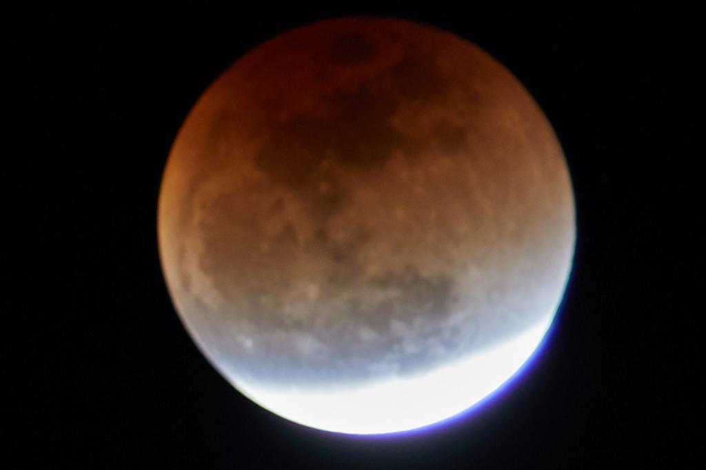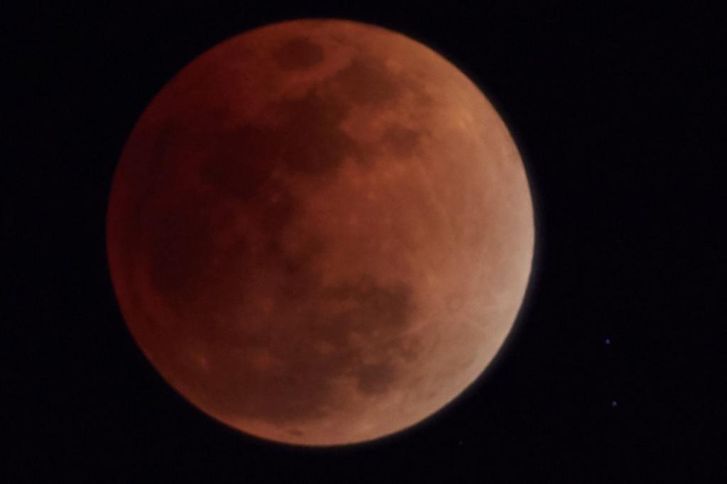 19时50分,在月亮左下角的光晕出现了缺口,这次的月全食观测正式拉开了序幕。随着时间的推移,月光也渐渐黯淡。黑点、椭圆、半球,在月亮上的阴影越来越大的同时,原本圆亮的月亮变成弯弯的月牙,月亮上的暗红色也愈发明显。在初亏开始的一个多小时后,最后的月牙消失,“红月亮”出现在黑色天际之中,反衬出星光的璀璨。