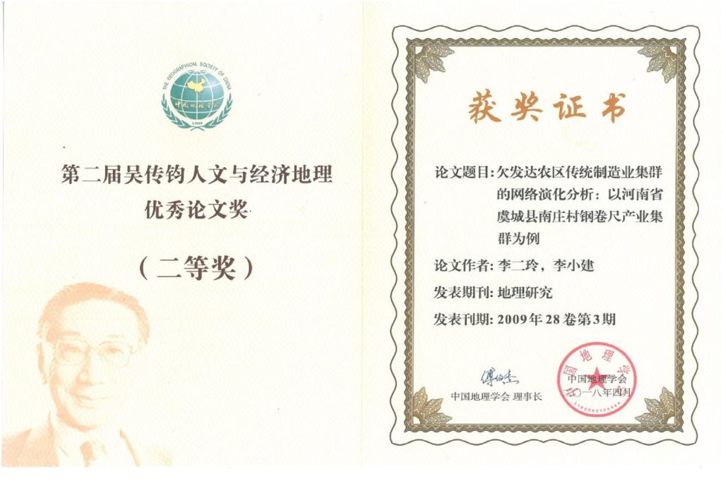 会议上,我院李二玲教授和李小建教授合作的论文荣获第二届吴传钧人文与经济地理优秀论文奖。本次评选在人文与经济地理领域影响力大,为了表彰近十年来在人文与经济地理研究中做出突出成绩的中青年学者,且2008-2017年在国内外学术刊物发表具有代表性的人文与经济地理学术论文。经中国地理学会专家组对检索到的200多篇论文及其作者进行了认真的审查评议,根据论文质量、学科分配、区域分布及作者影响力等指标,最终评出一等奖论文10篇、二等奖论文30篇。