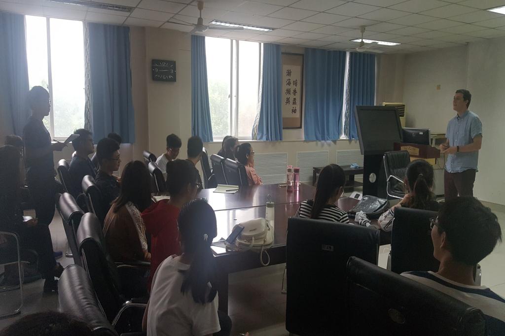 5月18日下午,Daniel Yoder Zipp 博士受邀来永利集团官网环境与规划学院地学楼二楼阅览室参加中美大学生交流座谈会。会议由张鹏岩副教授主持,学院教师、研究生及部分本科生参加。首先,Daniel Yoder Zipp作题为“美国大学的学习与生活环境”的报告,从研究项目介绍开始,研究生的学习生活;比较了中美两国学生与教授相处方式的不同,进而讲述两国学习、教育方式的差异。然后,结合自己的专业,介绍了美国大学对劳动力、城市与农村、经济发展的研究。随后,在场师生就两国日常生活及学习问题与Daniel Yoder Zipp 博士展开了热烈讨论,座谈会对于双方相互了解起到了很好的促进作用。