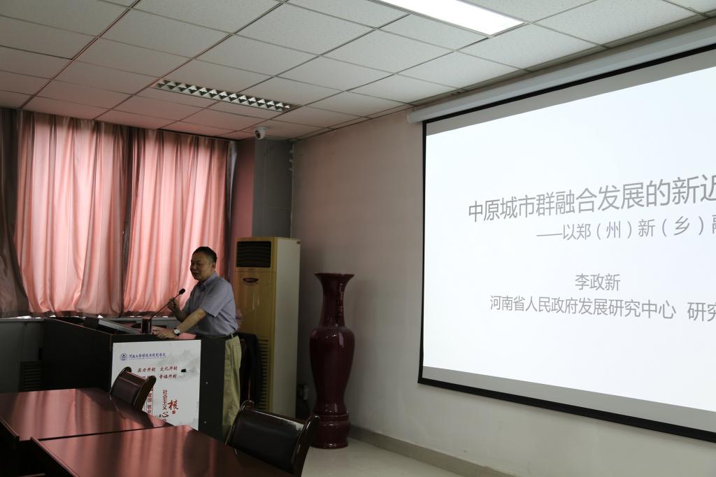 2018年5月25日上午,在环境与规划院二楼报告厅,河南省政府发展研究中心李政新研究员应邀作了题为“中原城市群融合发展的新近态势——以郑(州)新(乡)融合为例”的学术报告。会议由秦明周教授主持,学院约50名师生一同聆听了本次报告。
