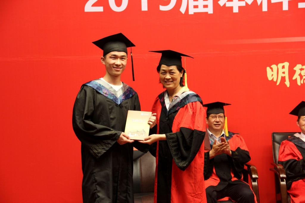 在雄壮的国歌声后,副院长赵威宣读了《yl23411永利集团官网关于授予普通本科毕业生学士学位的决定》。院长傅声雷为180名毕业生正冠拨苏、颁发学位证书,并与他们合影留念,学院党委书记闫峻为毕业生代表石霖颁发“心系母校•一元捐”活动捐赠证书。