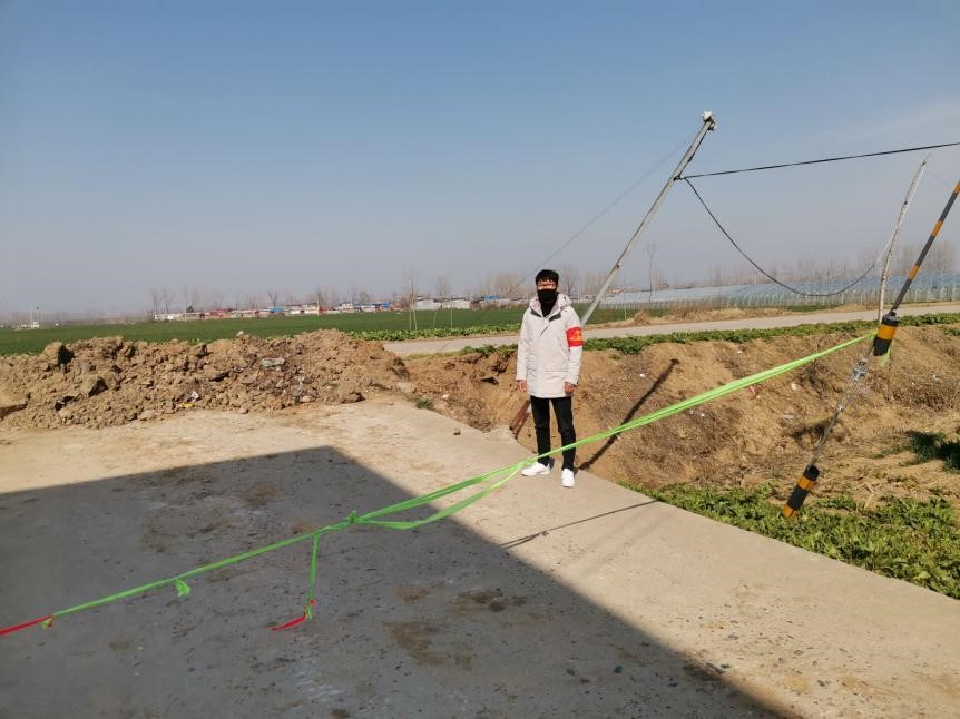 李喆,2016级本科生,2020年2月11日协助河南省淅川县龙城街道西湾社区志愿者完成社区西侧干道出口封路工作。