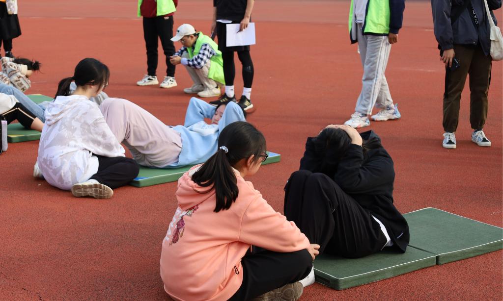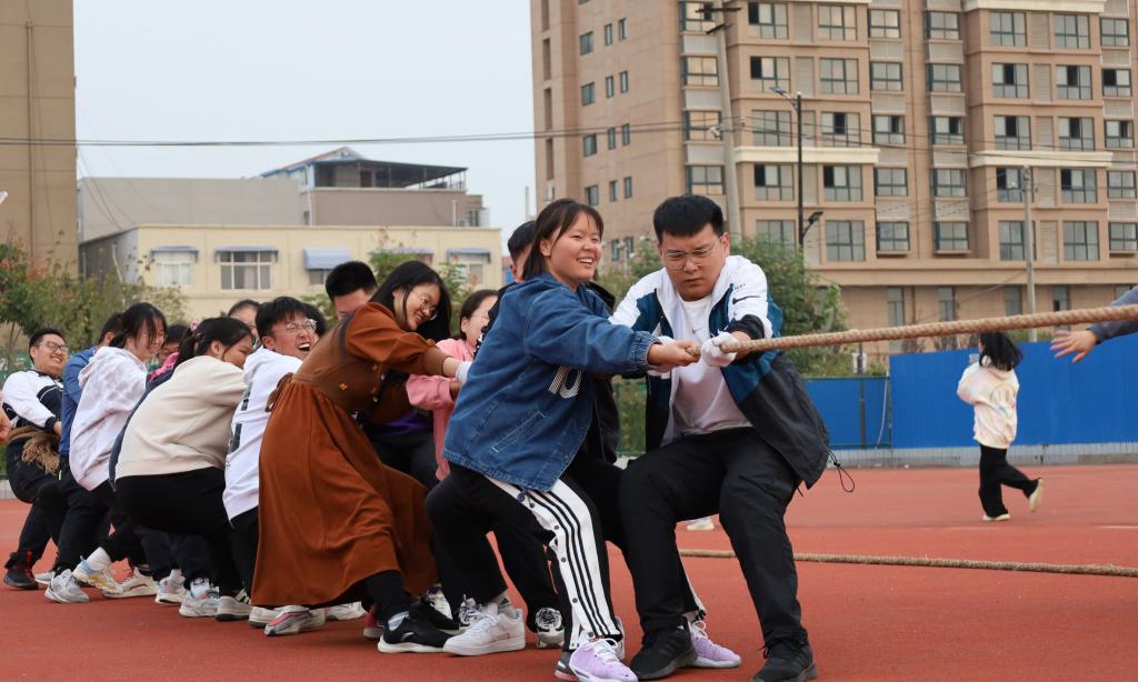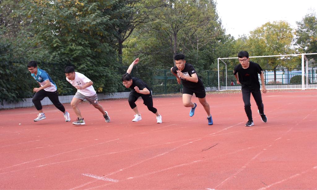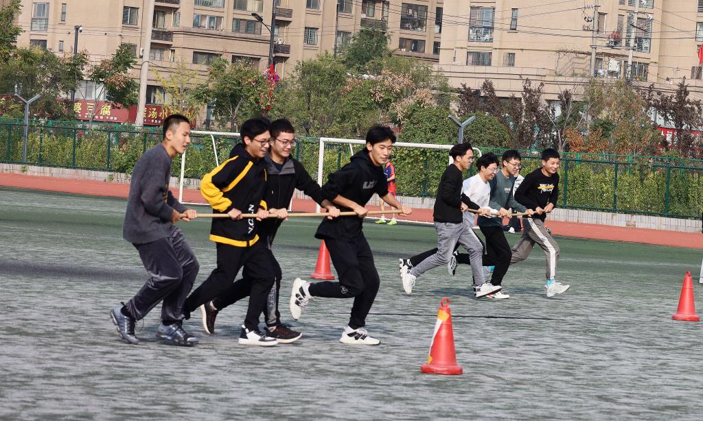 集体项目棍推乾坤的各班参赛队伍由八人组成,分为两组,每四人共持一根竹竿进行绕障碍物接力跑,学生们四人齐心协力,场外充满了欢声笑语。四人五足跑作为运动会上的常见项目之一,考验的是团队间的团结协作,只有配合默契,才能健步如飞。运动会最后,各参赛队伍之间进行了一场友谊拔河比赛,哨声起,操场上欢呼声加油声此起彼伏,震耳欲聋,参赛人员在赛场上为集体的荣誉拼尽全力。随后,在阵阵掌声和欢呼声中,运动会接近尾声,研究生队摘得比赛桂冠,19级地科班获得第二名,20级地信班获得第三名。