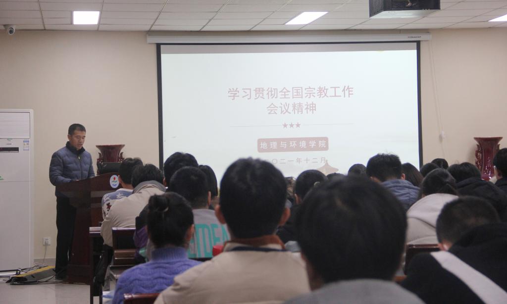12月23日中午,地理与环境学院在地学楼二楼报告厅组织开展了全国宗教工作会议精神学习会,采取线上、线下相结合的方式进行,党委副书记徐小军、2021级辅导员屈利铭和本科生辅导员马利群出席会议,2019级、2020级和2021级全体学生及研究生代表参会。会议由团委书记、2019级辅导员赵越主持。