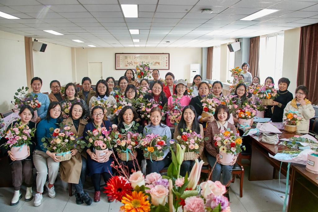 本次主题插花活动共有44名女教职工参加。活动开始前,邱永宽进行简短的发言,他赞扬了本次插花活动的意义,并为女教职工们送上节日祝福。活动邀请了专业的花艺老师现场指导,花艺师向女教职工们讲解了花材、色彩搭配等方面的知识,详细介绍了插花的艺术造型要素和技巧手法,并在现场做了生动的演示。接着女教职工们在插花老师的指导下,挑选花朵、修剪枝叶、整合造型,用灵巧的双手诠释了对花朵和美的理解。各色各样的花经过了她们的修剪整合,变成了一件件赏心悦目的艺术品。最后女教职工们和自己的插花作品进行合影留念。