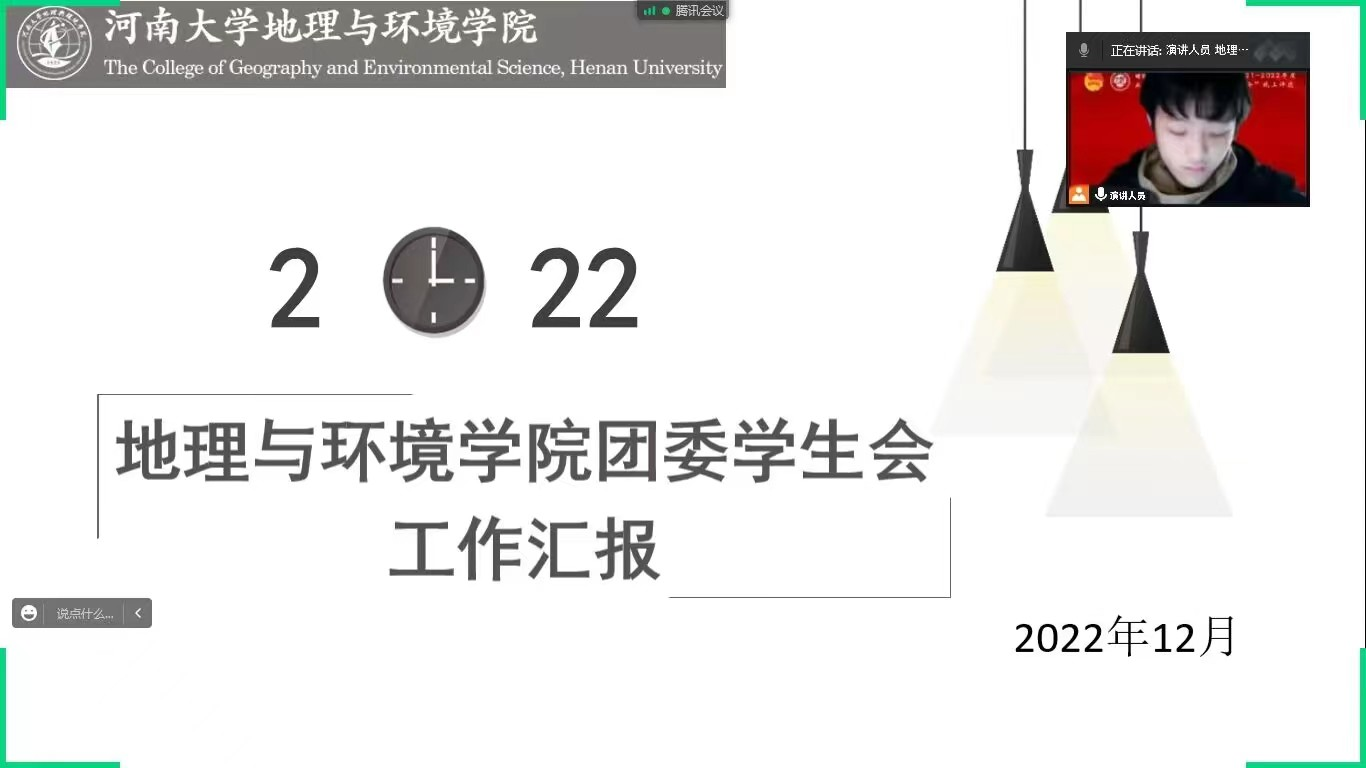 2020级人文地理与城乡规划班江尚勋代表我院学生会进行汇报展示。他从部门改革、工作成果、经验总结和未来计划四方面展开讲解:我院学生会分为团委、学生会、新闻与网络媒体中心三个有机结合的组织,坚持贯彻落实“全心全意为同学服务”的宗旨。在工作成果方面,江尚勋着重展示了我院承办的地球日系列活动,总结经验并反思改进。汇报最后,他提出了未来学生工作的目标与计划。