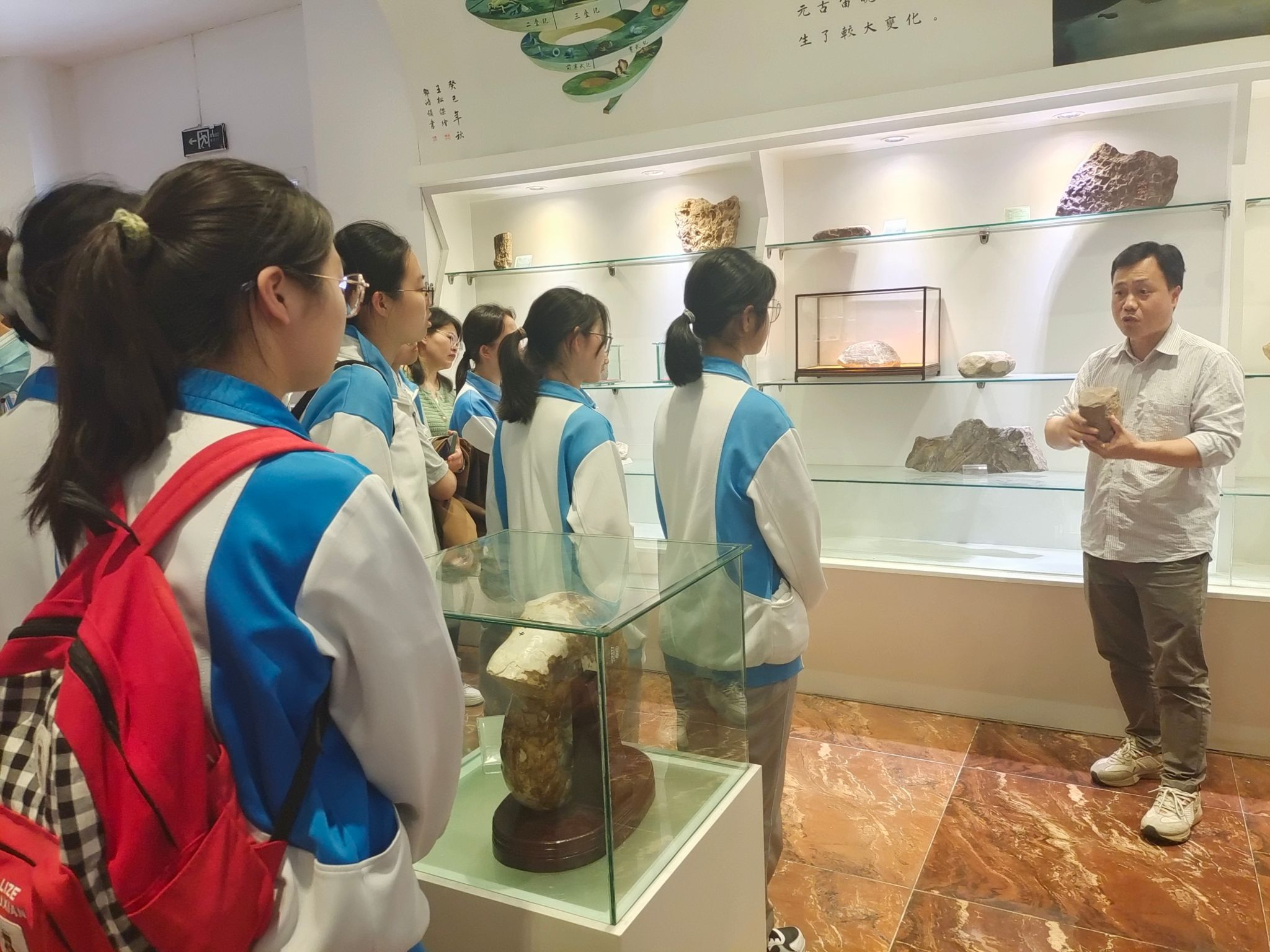 接着,丁志伟带领师生一行到我院特色东英地质博物馆参观。在博物馆内,陈英勇以地质年代为纲,以岩石标本为例,从动植物化石、岩石类型、地质构造、地学理论等多个方面进行了科普,为开封高中的学子们上了一节生动详实的“大学地理实践课”。在讲解观察岩石样本、动植物化石的过程中,开封高中学子积极参与提问与质疑,将课本知识转化运用,丰富了地理学视野,激发了学习地理学的热情。参观过后,我院教师与开封高中教师深入交流,分享地理教学心得和学科竞赛近况,共同致力于地理学优秀人才的培养。