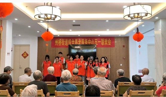 身穿红马甲的志愿者们在服务中心负责人的组织下,与在场爷爷奶奶们展开互动。老人们对志愿者的到来表示热烈欢迎。接着,志愿者们为爷爷奶奶们带来准备好的节目——舞蹈《最炫民族风》、手势舞《桃花朵朵开》、诗朗诵《青春中国》、歌曲《我和我的祖国》。在表演过程中,爷爷奶奶们与志愿者们一起跟着节奏挥手、鼓掌,整个活动现场洋溢着欢乐。