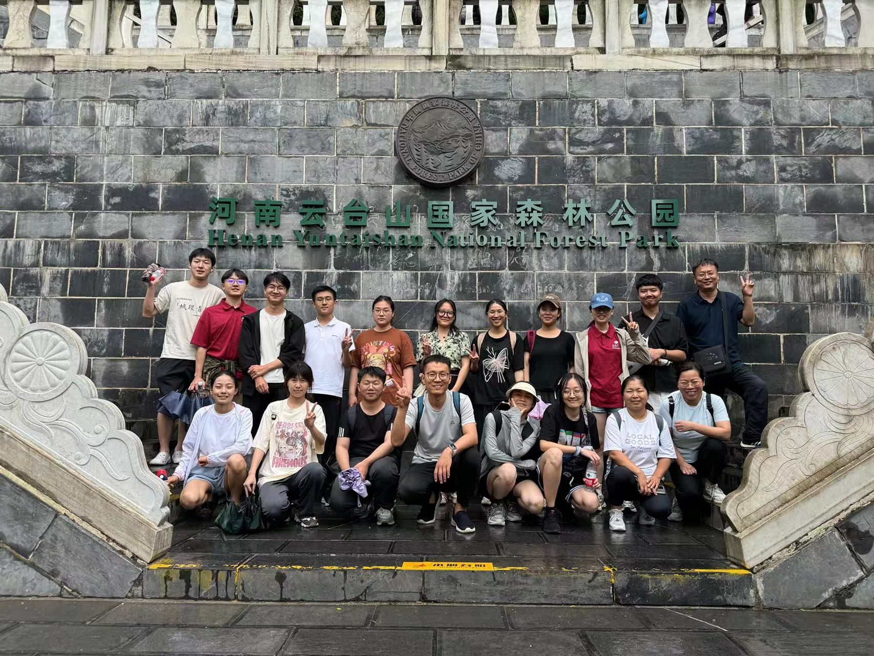 下午,同学们要前往茱萸峰景区,相传,王维名诗《九月九日忆山东兄弟》:“独在异乡为异客,每逢隹节倍思亲,遥知兄弟登高处,遍插茱萸少一人。”便作于此。登上峰顶,极目远眺,可见黄河如银带;俯视脚下,群峰形似海浪涌。山顶气候多变,倏忽间风起云生,白雾从山间咕嘟嘟地涌出,红日随即隐去。山峰在云雾中出没,云腾山浮,如临仙界。当同学们出发时,还有淅淅沥沥的雨水,地面也有些湿滑,但因为对地理和祖国山川河流的热爱,同学们毅然坚持要登顶茱萸峰。