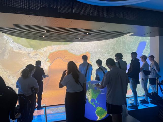 随后,王海鹰老师带领学生参观了虚拟仿真展厅,详细讲解了虚拟仿真裸眼3D技术,生动展示了黄河古贤站的水情变化,极大地激发了他们对黄河水利工程的兴趣。之后,魏亚飞老师向学生介绍了气候与环境变化实验室的构成和近期研究成果,围绕C-14测年、古气候研究、树木年轮气候学等展开详细说明。最后,陈英勇老师介绍了东英地质博物馆,刘欢带领学生体验了虚拟嵩山、虚拟开封、虚拟清明上河园等仿真平台和兰考减贫信息化系统。这些活动不仅拓展了学生的学术视野,而且加深了学生对黄河流域历史与环境研究的理解,同时提升了他们的实践操作能力,为其更好地理解yl23411永利集团官网黄河研究的国际化成果提供了支撑。
