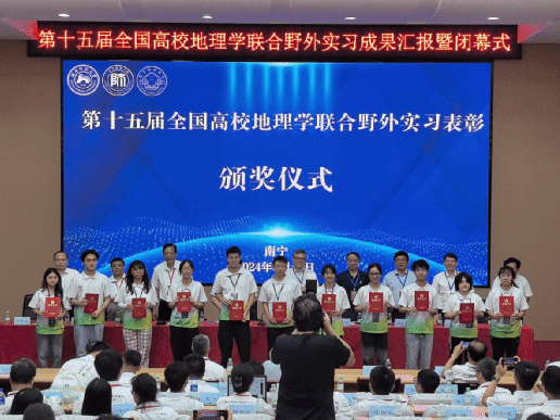 随后进行表彰环节。南宁师范大学教务处处长覃城阜教授宣读《关于表彰2024年第十五届全国高校地理学联合野外实习卓越实习生、优秀实习生、优秀指导教师的决定》。在热烈的掌声中,主席台上就座的嘉宾与领导们为荣获“卓越实习生”称号的同学们颁发了荣誉证书。经实习小组推荐和综合评估,我院吴玉琳同学表现优异,荣获“卓越实习生”称号。