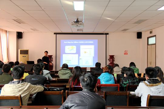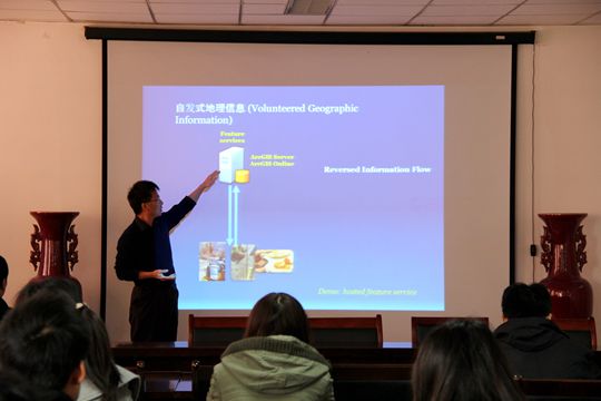 付品德从自身经历出发,首先简要介绍了Web技术与云GIS平台的三层架构:数据端、逻辑端和表现端。接着从GIS的商业价值、GIS与办公系统的融合、GIS与传感器的综合应用、GIS与物联网的结合等几个方面详细介绍了目前Web GIS研发取得的成果与其在社会生活中的应用,并风趣地称“人,才是移动的鼠标;而现实世界则是1:1的地图”,因此,GIS的应用发展方向更应该去增强现实感,从而实现3D运行向4D近实的战略性动态发展。付品德更鼓励与会大学生要勇于展现个人想法并付诸实践。报告会上学院老师与付品德交流“Web GIS是技术直接应用,还是二次开发?”、“传统Web GIS到云计算,从而推动大数据时代的到来与发展,每个过程的飞跃性体现在哪里?”等问题。