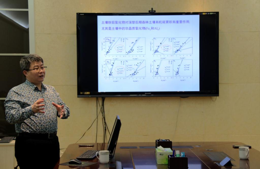 在闫俊华简单的自我介绍之后,讲座正式开始。闫俊华首先提出三个贴近生活的小问题来引起大家的思考,并由酸雨引出森林土壤对酸的缓冲过程。随后,他对演替过程中土壤有机碳储量的变化过程进行的详细的讲解,指出演替后期及演替前期和中期碳储量不同是由于土壤铁铝氧化物对后期土壤有机碳积累起重要作用。最后,闫俊华对自己的研究成果进行了深入浅出地介绍,在场的老师和同学们都认真仔细地聆听了此次报告会,现场不时响起热烈的掌声。