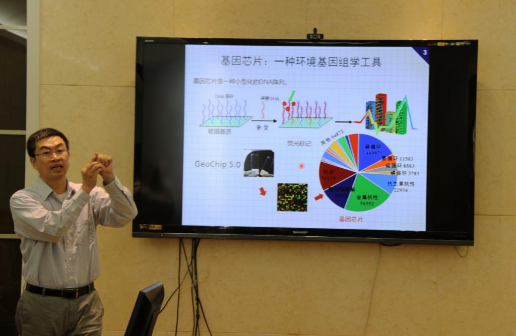 在杨云锋教授简单的自我介绍之后,讲座正式开始。杨云锋教授首先提出“微生物驱动的地球化学是面向节能减排、气候变化、污染治理等国家重大战略需求重要方向”的观点,从而引出微生物丰度与碳氮循环过程的关系。随后,他着重讲解了移栽模拟实验,探究实验中微生物群落物种和功能基因组成,在发现青藏高原表层土壤碳库实测值与模式预测不符后,建立了微生物碳库模型来预测土壤碳库,比传统碳库模型可多解释约18%的土壤呼吸观测值。最后,杨云锋教授得出“在未来CO2浓度继续上升的气候背景下,土壤呼吸可能会继续增加,由此造成的碳库损失也会加快”的结论。论述过程由点及面,深入浅出,不时穿插一些生动的小故事,使讲座灵动有趣。