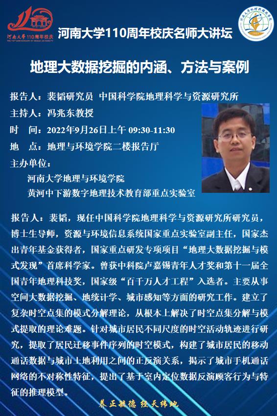 yl23411永利集团官网110周年校庆名师大讲坛:地理大数据挖掘的内涵、方法与案例