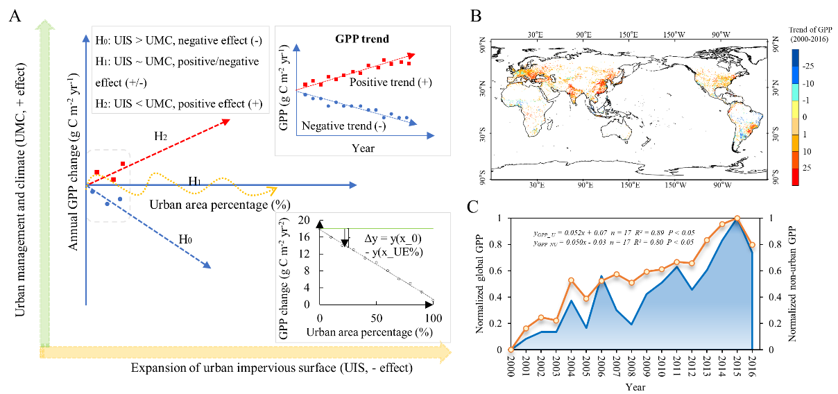 城市区域的范围是动态的,其影响范围或城市足迹更非一成不变,其主要包括城市及与城市有密切联系的城郊和邻近的农村地区。城市生态系统复杂,量化和理解城市生态系统的结构、功能和服务一直是一个挑战,城市化在全球范围内对GPP的影响也缺少关注。在这项研究中,作者将全球城市地区组织为0.5°空间分辨率的城市网格单元,分析全球城市地区GPP的时空变化,评估量化城市扩张(UE,由UIS表示)和城市管理与气候(UMC)对植被(URV)的影响。研究发现在全球城市网格单元中,虽然单个网格单元中城市面积占比一直在增加,仍有79.3%的城市网格年GPP呈增长趋势。城市扩张对GPP的负面影响在一定程度上被网格单元内的植被所补偿,而这种补偿主要得益于城市管理和局地的气候环境。