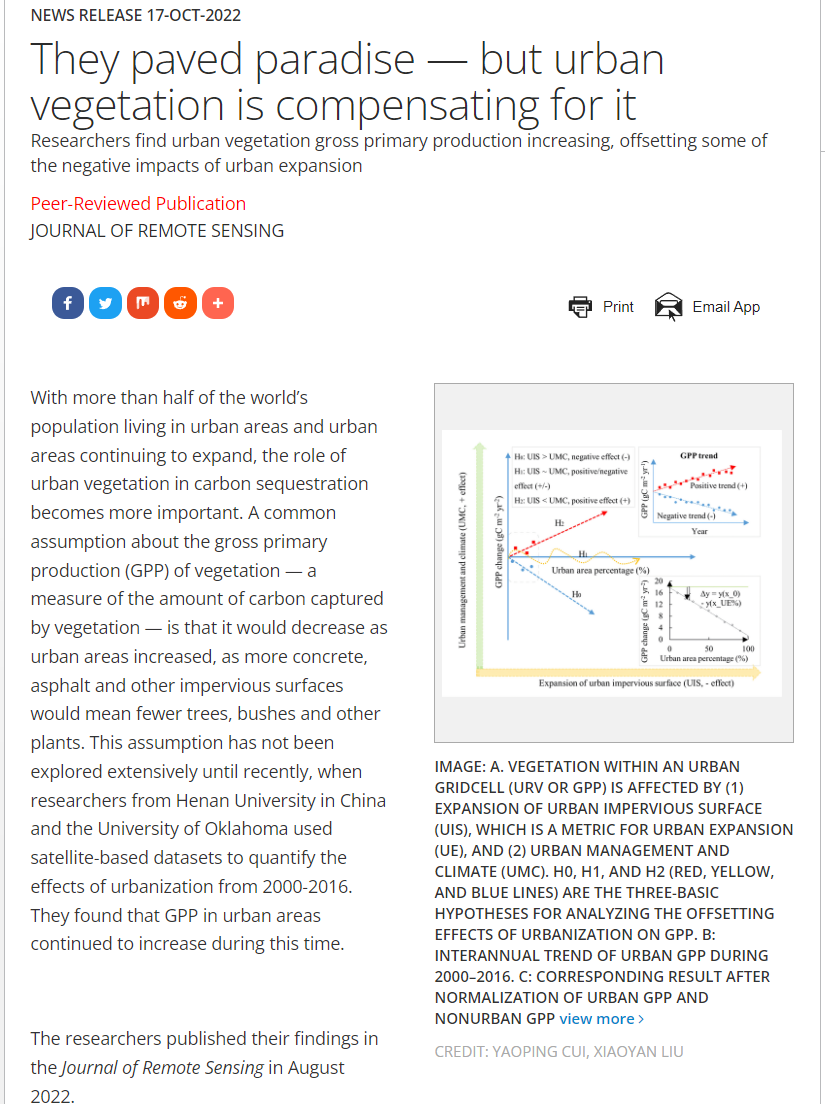 近日,Science伙伴期刊《Journal of Remote Sensing》发表我院崔耀平教授团队和美国俄克拉荷马大学萧向明教授团队的合作成果“Continued Increases of Gross Primary Production in Urban Areas during 2000–2016”。美国科学促进会(AAAS)主办的科学新闻网EurekAlert!以“They paved paradise — but urban vegetation is compensating for it”为题对该项成果进行了报道,Bioengineer.org和Mirage News等多家科学新闻媒体予以转载。