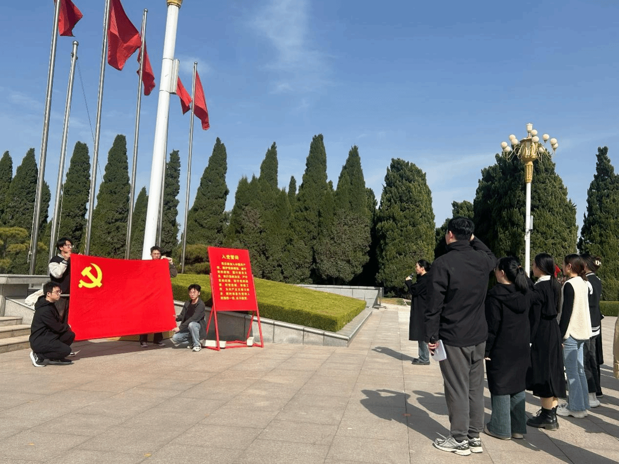重温入党誓词后,张怡媛带领支部党员和积极分子祭扫烈士墓,参观烈士纪念碑,了解英雄事迹,学习革命精神,缅怀先烈,寄托哀思。默哀毕,由支部宣传委员董煜硕带来英烈故事宣讲,通过宣讲开封战役中尖刀连连长张铁柱的英雄事迹,帮助各位党员和积极分子了解先烈们为了革命事业抛头颅、洒热血的壮烈史诗,更加珍惜如今和平的来之不易。