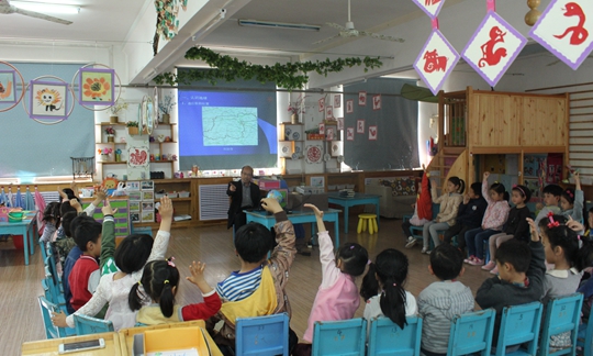 课堂还未开始,闫老师就亲切地与小朋友们交谈,很快融入到了小朋友的世界。课堂上,闫老师首先从小朋友们最感兴趣的地图入手,按照范围区域的大小顺序依次介绍了开封地图、河南地图、中国地图以及世界地图,并提出一些诱导性的问题,小朋友们争先恐后地抢答、连答,现场气氛十分活跃。随后,闫老师又讲述了他在美国的经历并展示出躺着在美国大街上流浪汉的图片,以此希望小朋友们能好好学习,从小立志,为祖国做贡献。