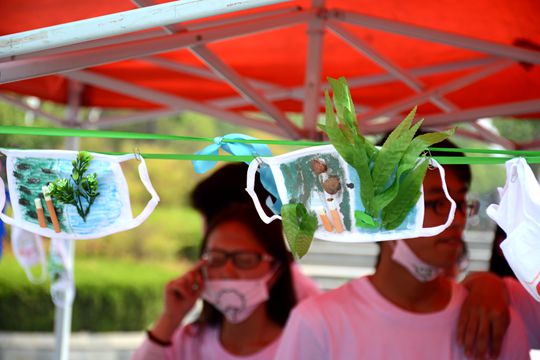 广场正中央的石台上,放置着一个半球形充气帐篷,外部画成了宇宙中蔚蓝地球的模样。半球形的内部“住着”十个代表国家的标志建筑和用废旧衣服剪成的雾霾云朵,在“乌云”上签下自己的环保宣言并撕下带走,地球就会露出蓝天和白云的美好景象。