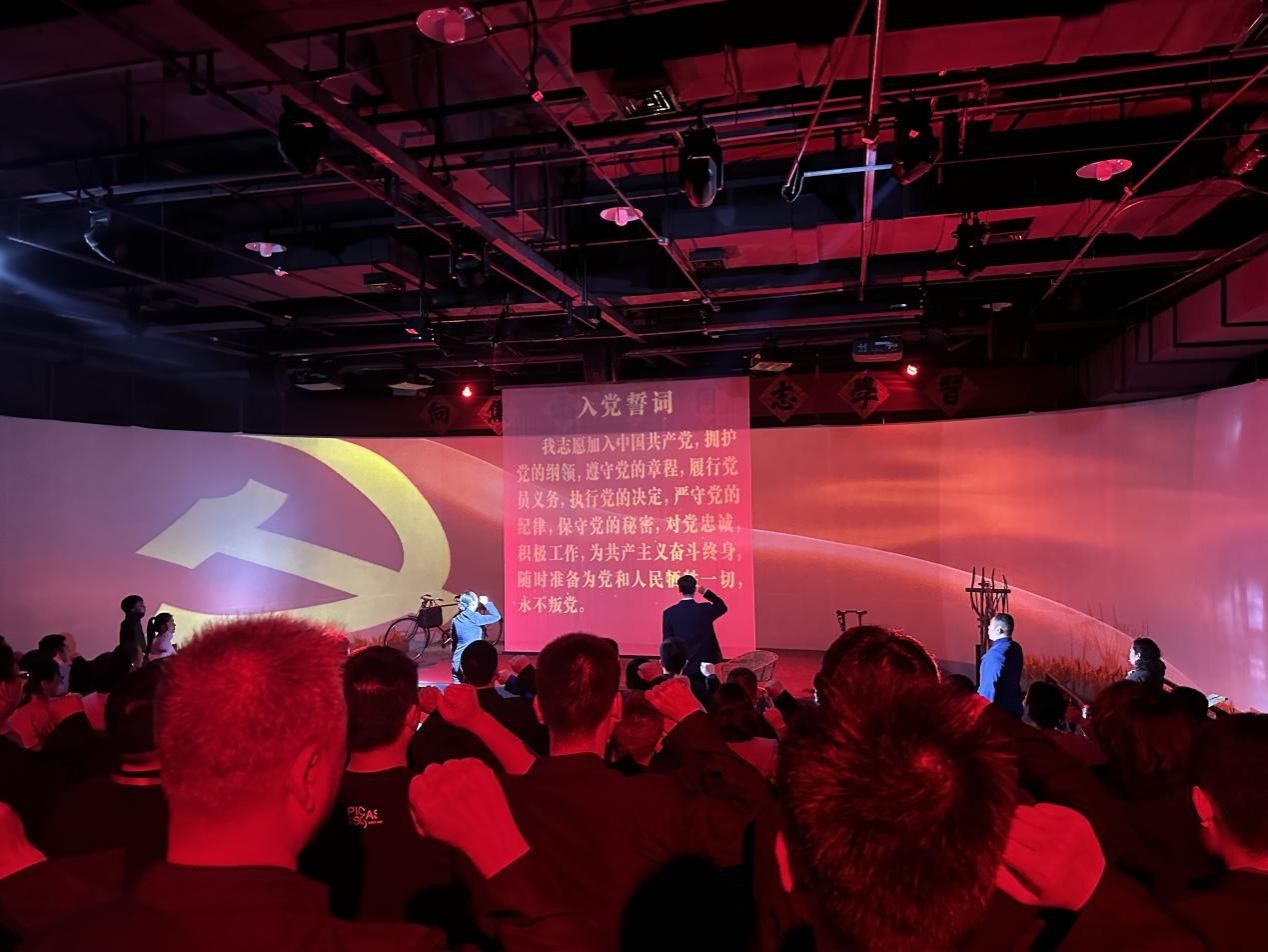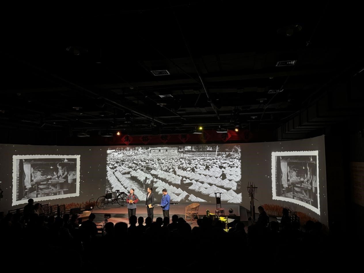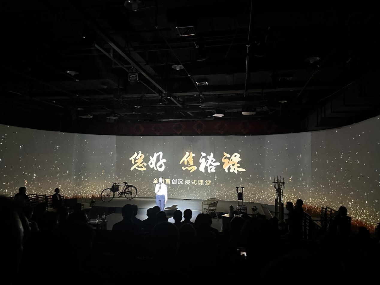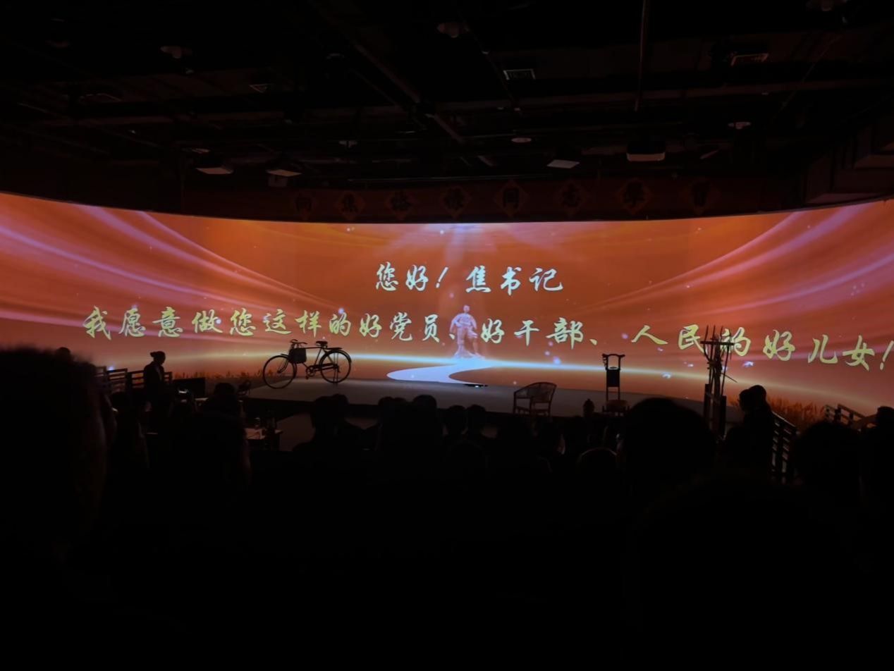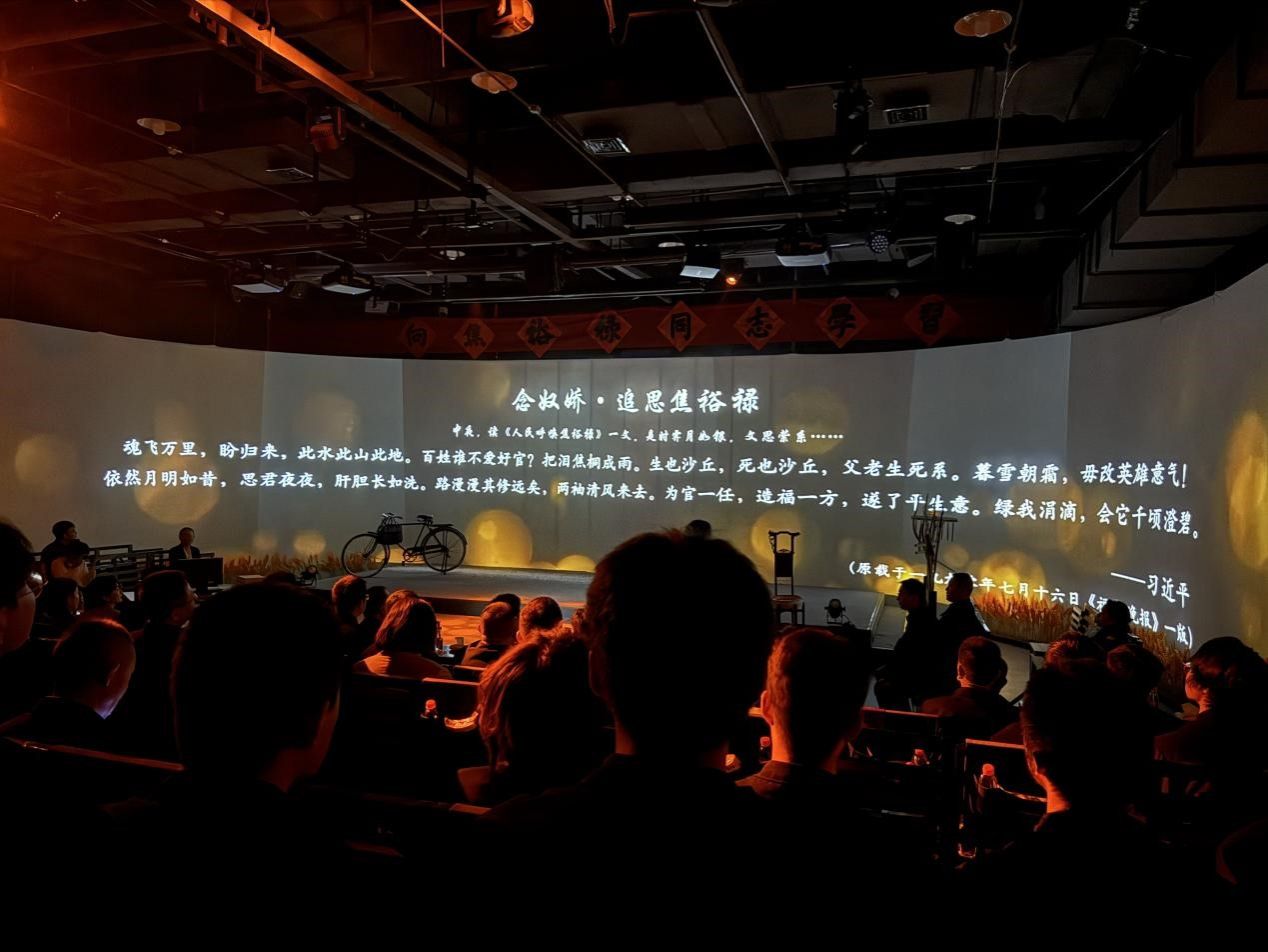 《您好,焦裕禄》课堂采用专业演员与抽取观众作为临时演员相结合的方式,让观众亲身参与其中,增强体验感与代入感。影片依照焦裕禄干部生平经历徐徐铺陈,从家乡山东博山积极投身革命浪潮,光荣加入中国共产党;到洛阳矿山机器厂,参与新中国工业建设;再到河南尉氏县,带领群众参与农业生产与基层治理,为地方发展辛勤耕耘;最后到河南兰考县,直面风沙、内涝、盐碱“三害”,以无畏担当和顽强毅力,全身心投入兰考的治理与发展事业。在情节推进过程中,影片巧妙地运用各地点的相关人员,如家属、战友、同事等,把故事自然地串联起来,勾勒出一个立体而真实的焦裕禄形象。影片结尾,全体观众在庄严肃穆的氛围中齐声朗读入党宣誓词,重温入党时的初心与使命。最后,演员饱含深情地吟诵习近平主席所作的《念奴娇·追思焦裕禄》,“生也沙丘,死也沙丘”的激昂词句在剧场内久久回荡。字字句句,既是对焦裕禄精神的深情礼赞,也点燃了在场观众心中的敬意。吟诵声落下后,全体观众以最诚挚的声音齐声高呼:“您好,焦书记!我愿意做您这样的好党员、好干部、人民的好儿女!”这跨越时空的问候,将现场对这位人民公仆的无限缅怀与崇高敬意推向了最高潮。