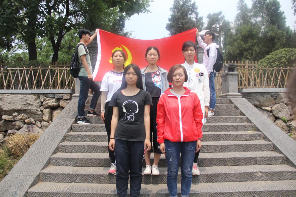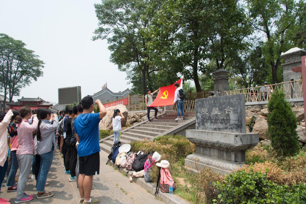 “我志愿加入中国共产党,拥护党的纲领,遵守党的章程,履行党员义务,执行党的决定,严守党的纪律,保守党的秘密,对党忠诚,积极工作,为共产主义奋斗终身,随时准备为党和人民牺牲一切,永不叛党。”在登封观星台实践基地前,2016级团支书王真琪带领所有师生在党旗下宣誓。
