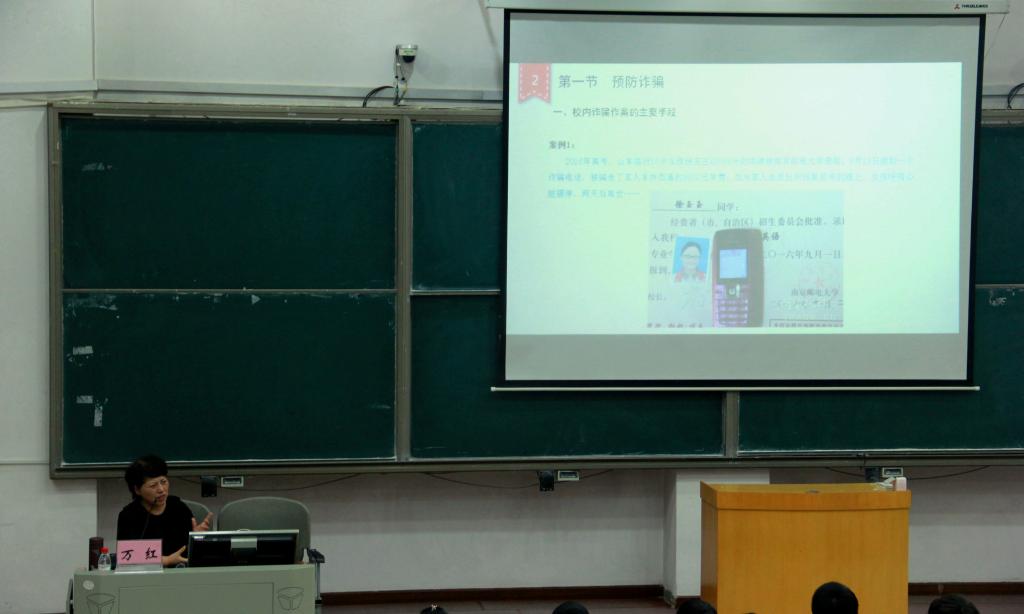 万红老师围绕国家安全、财产安全、人身安全、交通安全、心理健康安全、网络安全等主题案例教会大家如何保护自己,如何减少危害,以及如何处理突发事件。在谈到心理健康安全的时候,万红老师讲述了一系列校园内外意外事故的发生,并举出一些实例,如某些男生对异性图谋不轨,某学生与室友作息冲突等因为一时冲动犯下故意伤人罪。这些血淋淋的教训警示同学们,切勿盲目冲动,增强分辨能力,提升法律意识。万红老师还特别提到,开学期间是新生最应该警惕的时期,他生动详细地为大家讲述了信息化时代下各种诈骗手段,一再警示大家安全无小事,要求大家居安思危,注意日常安全。