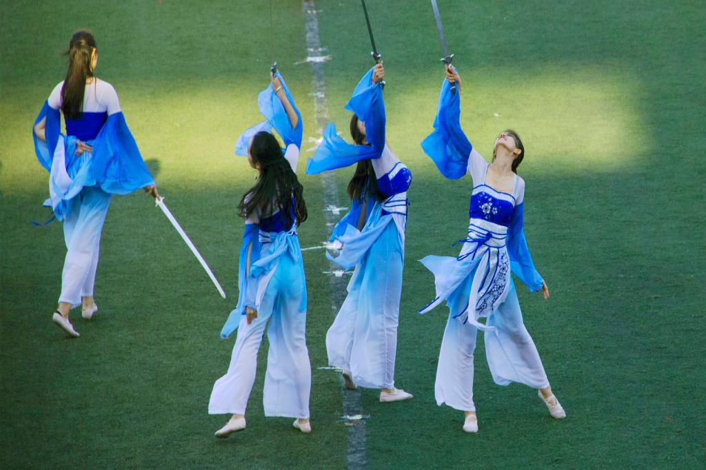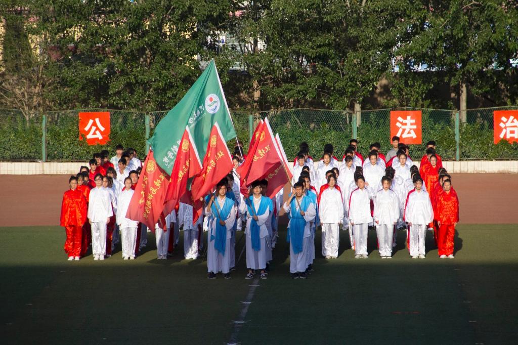我院17级代表队最后上场。在气势恢宏的武侠音乐中,旗手和舞蹈队员们闪亮登场,部分参赛选手随之以十字散开,队形整齐有序,一步到位。旗手们铿锵有力的挥舞着旗帜,曼妙的舞姿、潇洒的挥剑、飘逸的裙摆,赢得了主席台观众们的热烈掌声。随后,在领队的一声令下,太极方阵分别从两边和后方同时进场,并进行迅速调整,俨然有序、整装待发。太极音乐响起后,队员们合着音乐的节拍起势、转身、俯身下按,个个挥洒自如,连贯有序。同学们将太极拳含蓄内敛、以柔克刚、急缓相间的拳术风格淋漓尽致地展现在裁判眼前,就如“一匹匹野马在整齐分鬃,一个个白鹤在舒缓展翅。”值得一提的是,我院队员脸上的地球标识格外引人注目,新颖有趣。队员们的动作娴熟自如,队列整齐划一,完美地诠释了中国传统太极拳的独特魅力。最终,我院在本次太极拳比赛中荣获第八名。