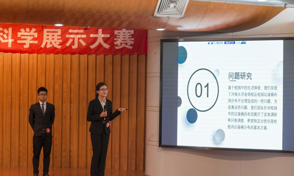 比赛分人文组和自然组进行展示,经过初赛和复赛的选拔,共4支自然组和10支人文组队伍突出重围,晋级决赛。比赛由“展示”和“答辩”两个环节组成,评委根据选手精神风貌、团队配合和作品选题科学性、创新性等进行现场评审。