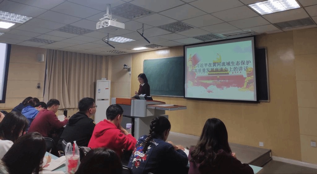 本科生第二党支部书记韩晓静领学了习近平在黄河流域生态保护和高质量发展座谈会上的讲话。她指出,习近平总书记一直很关心黄河流域的生态保护和高质量发展,他曾多次实地考察黄河流域生态保护和发展情况,多次就三江源、祁连山、秦岭等重点区域生态保护建设提出要求。就黄河流域生态保护和高质量发展问题,习近平总书记分别从保护黄河是事关中华民族伟大复兴的千秋大计、新中国成立以来黄河治理取得巨大成就、黄河流域生态保护和高质量发展的主要目标任务、加强对黄河流域生态保护和高质量发展的领导四个方面谈了自己的意见。
